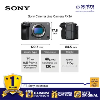 Dengan desain ringkas untuk pemotretan solo, aplikasi perjalanan, atau sebagai kamera B yang ideal, Sony FX3A mengadopsi gaya kamera Cinema Line dan Alpha untuk menciptakan kamera sinema portabel yang optimal. FX3A memiliki semua atribut pencitraan yang Anda harapkan dari kelasnya, tetapi dengan bentuk genggam yang ringan dan ramping, profil yang ramping, serta desain "bebas sangkar", yang memungkinkan Anda untuk memasang berbagai aksesori langsung ke bodi kamera.