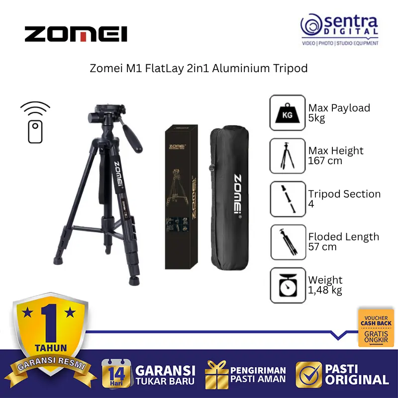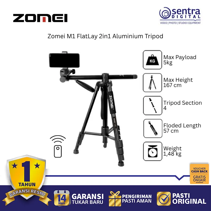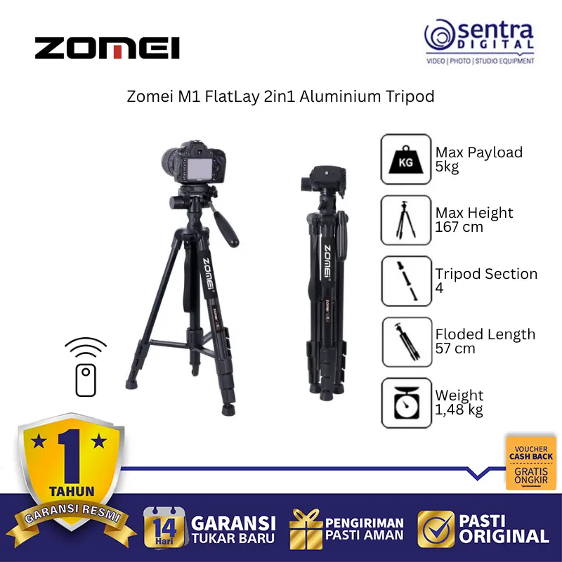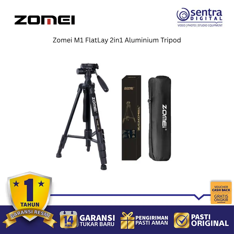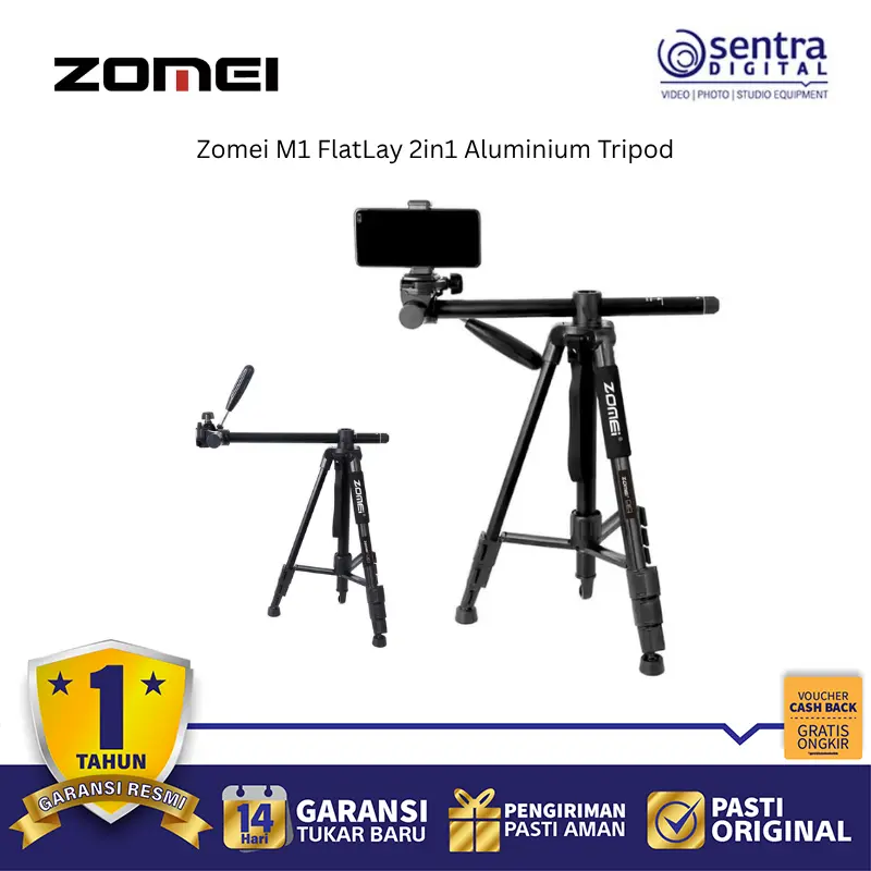 Zomei M1 FlatLay 2in1 adalah tripod multifungsi yang dapat digunakan sebagai tripod standar maupun monopod, ideal untuk fotografi flat lay, vlogging, dan konten kreatif. Dengan desain ringan dan kaki fleksibel, tripod ini cocok untuk penggunaan indoor maupun outdoor. Cocok untuk kamera DSLR, mirrorless, dan smartphone dengan adaptor tambahan.