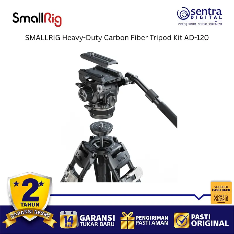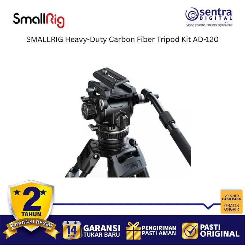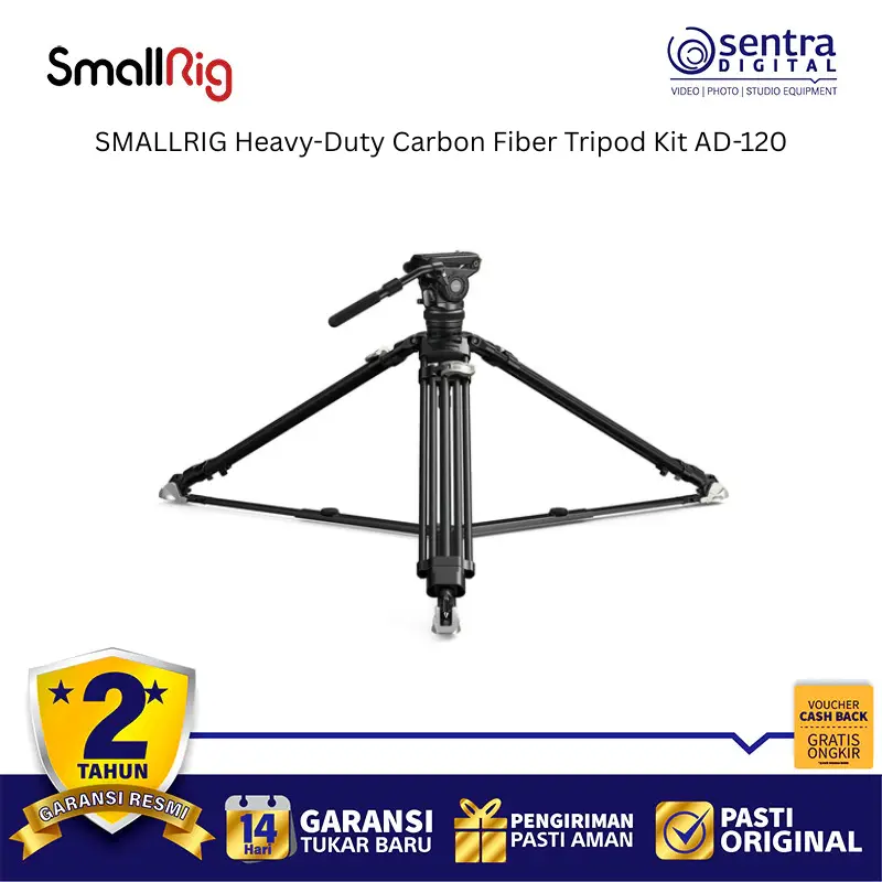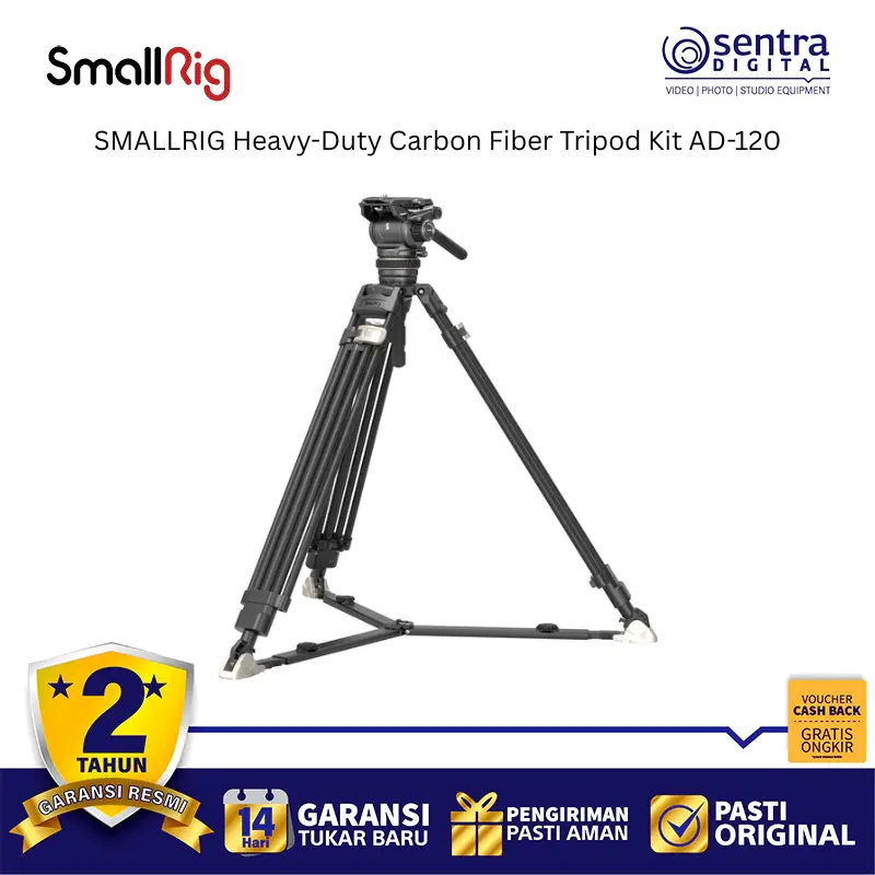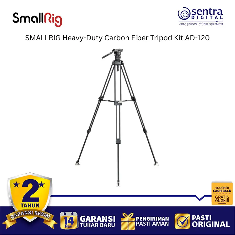AD-120 Heavy-Duty Carbon Fiber Tripod Kit  dari SmallRig adalah sistem tripod video yang tahan lama dan portabel untuk fotografer, videografer, dan vlogger profesional. Sistem ini mencakup kepala tripod profesional DH12 dan kaki tripod serat karbon tugas berat. Tas jinjing untuk menyimpan dan mengangkut seluruh sistem, serta dudukan ponsel pintar untuk memasang ponsel Anda dengan mudah.
