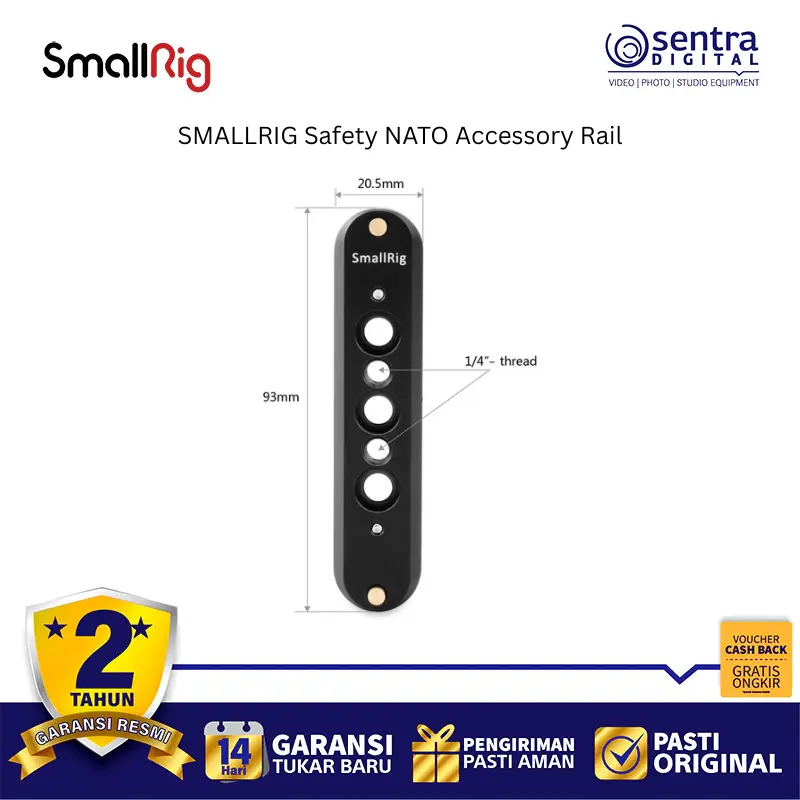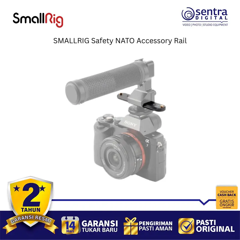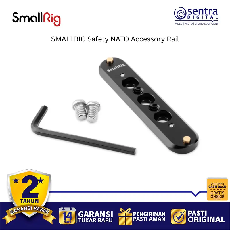 SMALLRIG Safety NATO Accessory Rail 1933 adalah rel NATO tipis untuk kit kunci NATO. Rel ini terpasang pada sangkar kamera Anda dengan sekrup 1/4";-20, yang memungkinkan akses ke gagang dudukan NATO, dudukan EVF 1594, atau aksesori lain yang kompatibel dengan NATO. Pin pengaman berpegas di setiap ujung rel mencegah aksesori terlepas secara tidak sengaja. Selain itu, Anda juga dapat memasang dudukan sepatu yang langsung terhubung dengan port dudukan sepatu kamera.