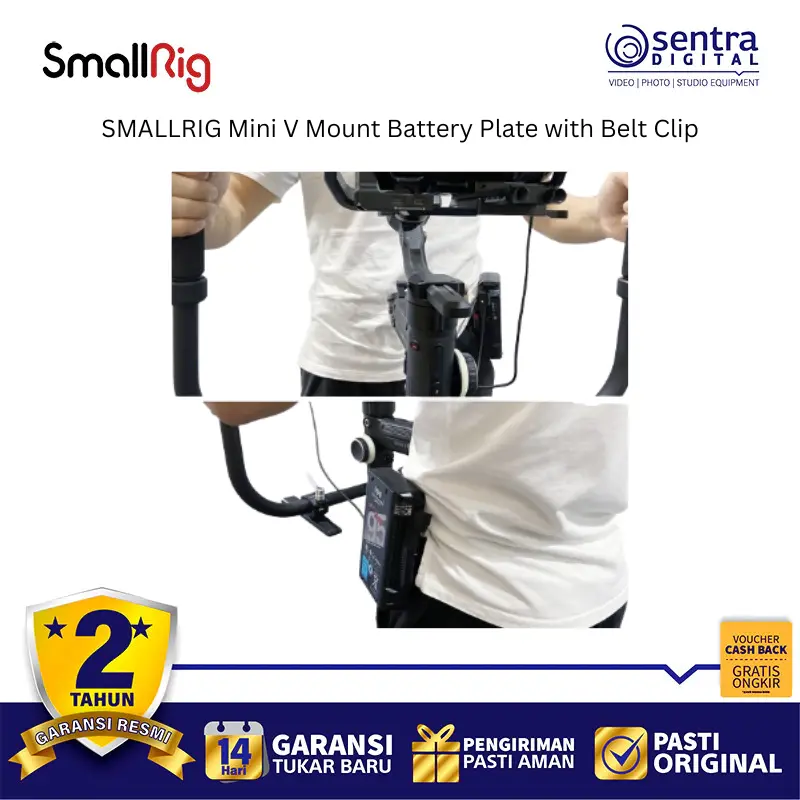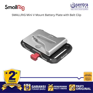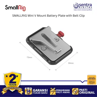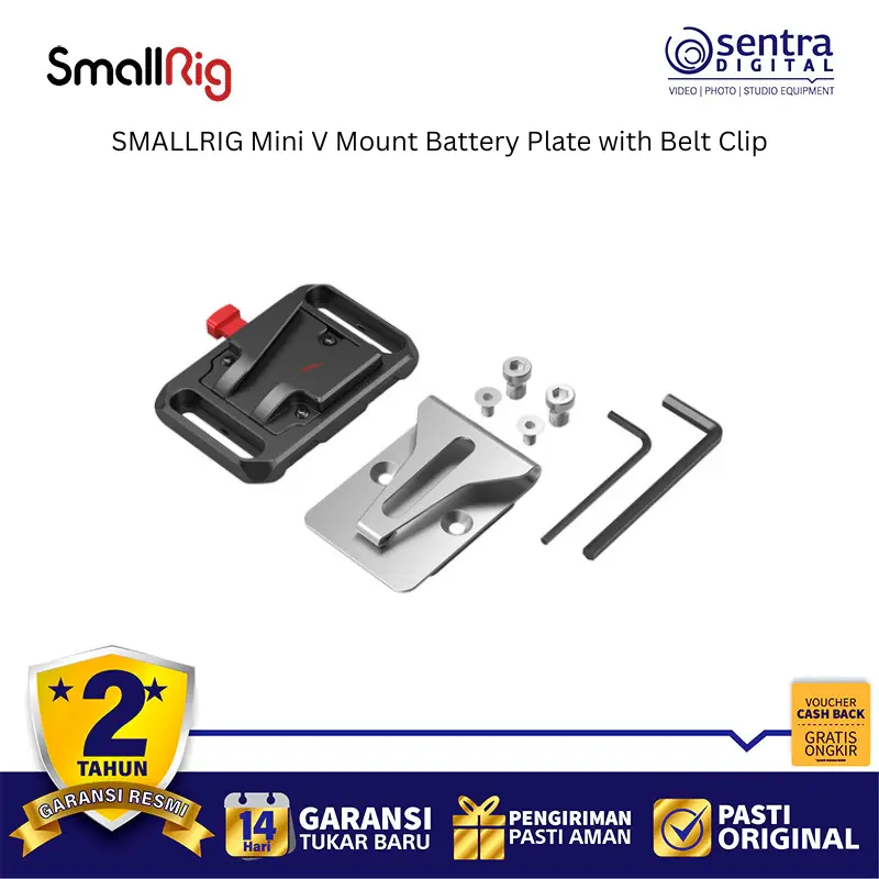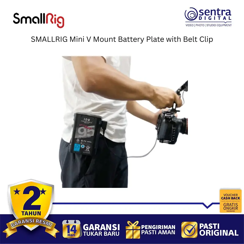 ini . Dudukan ini dilengkapi dudukan V-lock dengan tuas pelepas cepat yang cocok untuk sebagian besar baterai V-mount. Di bagian belakang, terdapat klip sabuk yang terpasang pada permukaan tipis seperti sabuk atau tali. Klip ini dapat ditekuk di bagian samping untuk mencegah selip.