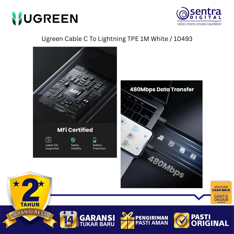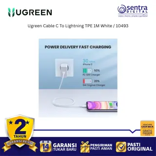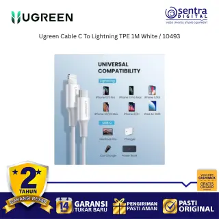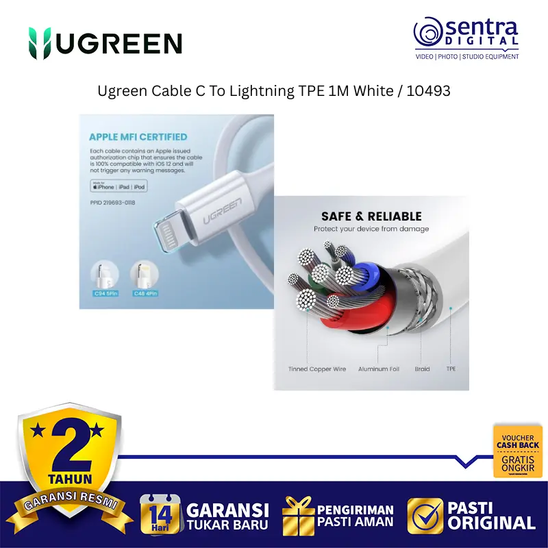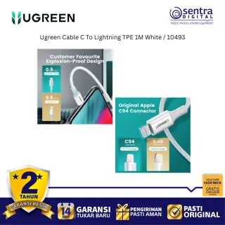 Ugreen USB-C ke Lightning Cable 1M Putih (Model 10493): Kabel ini adalah kabel pengisian daya dan data USB-C ke Lightning yang dirancang untuk perangkat Apple.