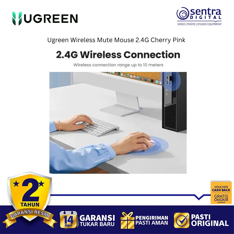 (merah muda ceri) yang beroperasi pada frekuensi 2.4GHz melalui penerima USB, menawarkan koneksi yang stabil. Fitur utamanya adalah desain "Mute" yang