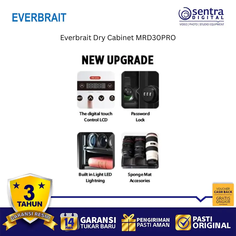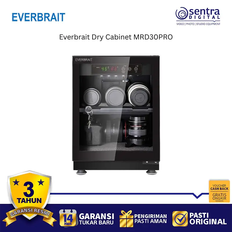 Everbrait Dry Cabinet MRD30PRO adalah lemari pengering kompak yang dirancang untuk melindungi peralatan fotografi dan optik Anda dari kelembaban berlebih. Dengan kapasitas 30 liter, kabinet ini menggunakan sistem dehumidifikasi elektronik yang bekerja secara otomatis untuk menjaga tingkat kelembaban relatif (RH) ideal, biasanya antara 25% hingga 60%. Kabinet ini dilengkapi dengan tampilan digital untuk memantau suhu dan kelembaban di dalamnya, serta memiliki pintu kaca tertutup rapat dan rak yang dapat disesuaikan, menjadikannya solusi penyimpanan yang andal dan hemat energi untuk mencegah tumbuhnya jamur pada lensa dan kamera Anda.