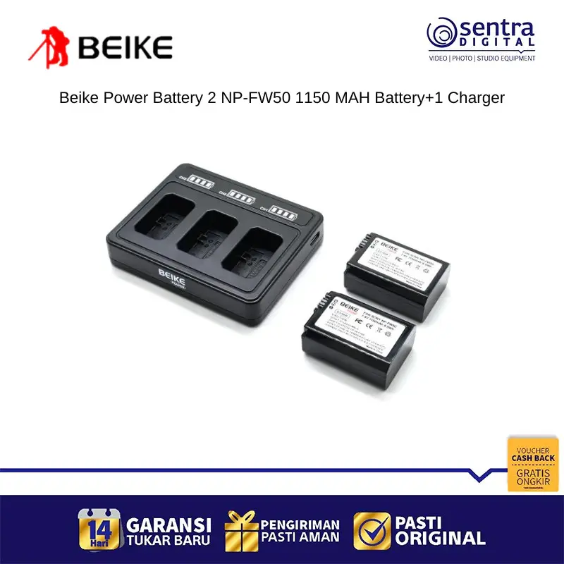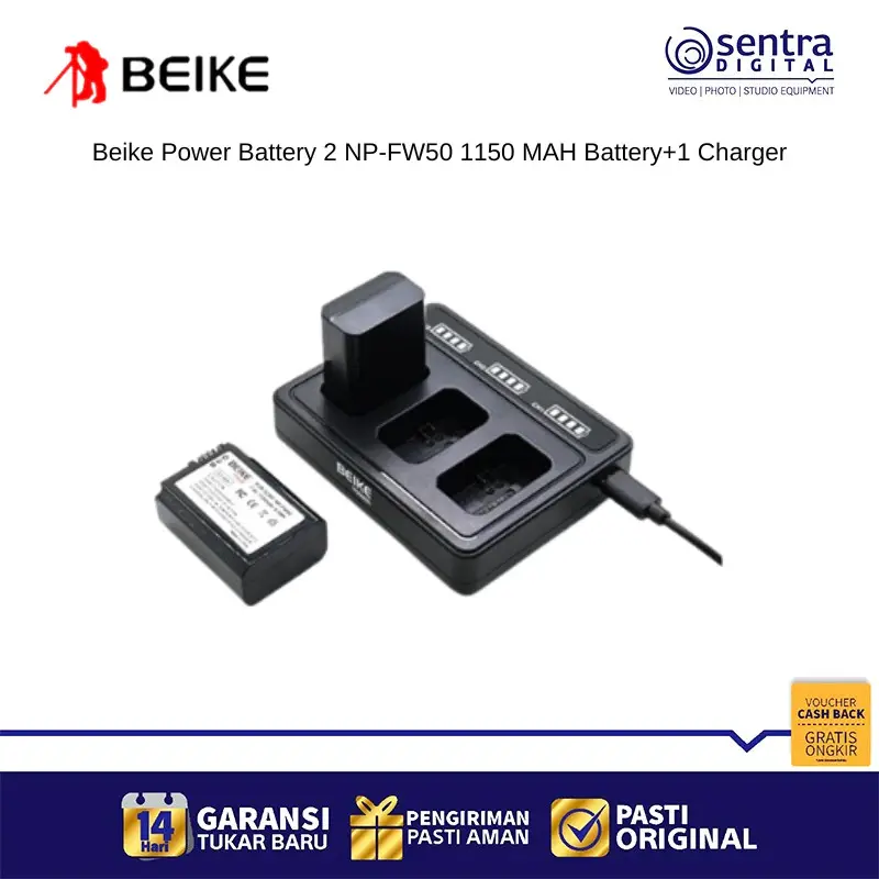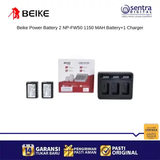 Paket ini menawarkan solusi daya cadangan lengkap yang terdiri dari dua unit baterai NP-FW50 dengan kapasitas masing-masing 1150 mAh dan satu charging dock (dok pengisian) yang praktis. Baterai Beike ini bertujuan untuk menyediakan performa daya yang stabil dan memiliki fitur unggulan teknologi pengisian otomatis (Auto-Stop Charging) untuk menjaga umur panjang siklus baterai. Dengan kelengkapan dua baterai dan satu charger pengisi daya, paket ini sangat ideal bagi fotografer yang membutuhkan daya tahan ekstra untuk sesi pemotretan yang lebih lama.