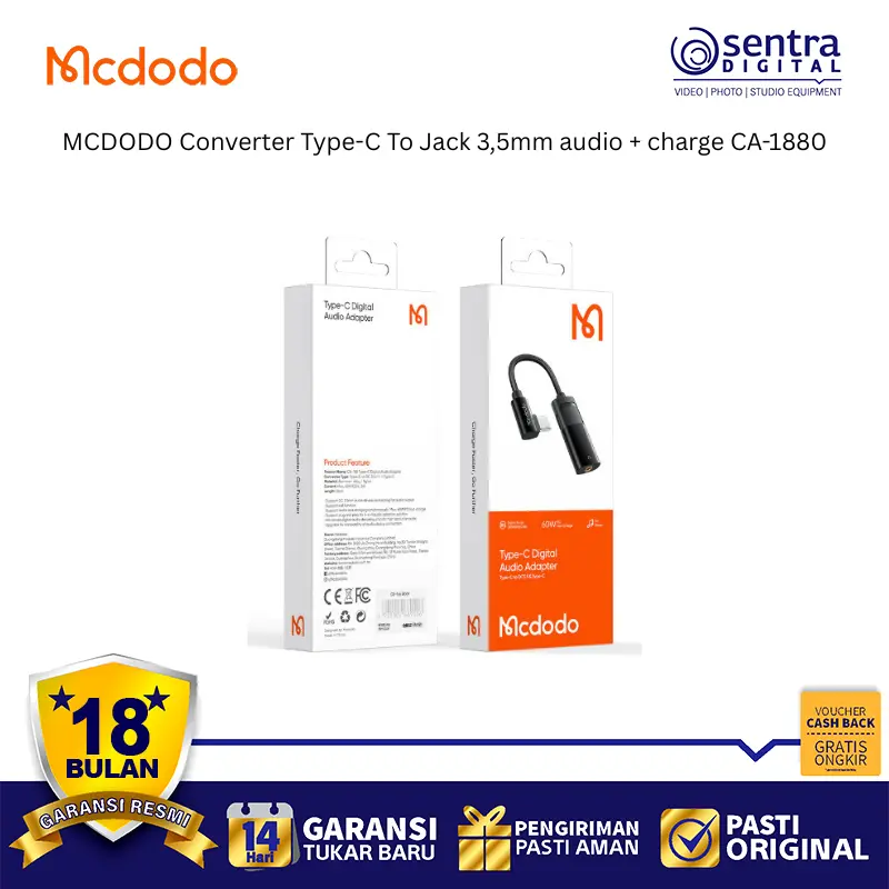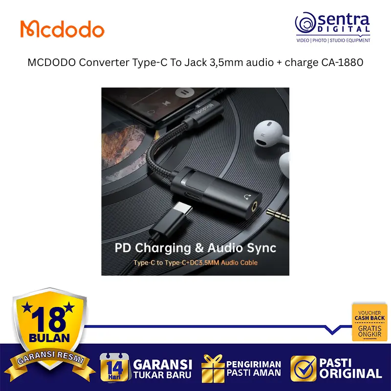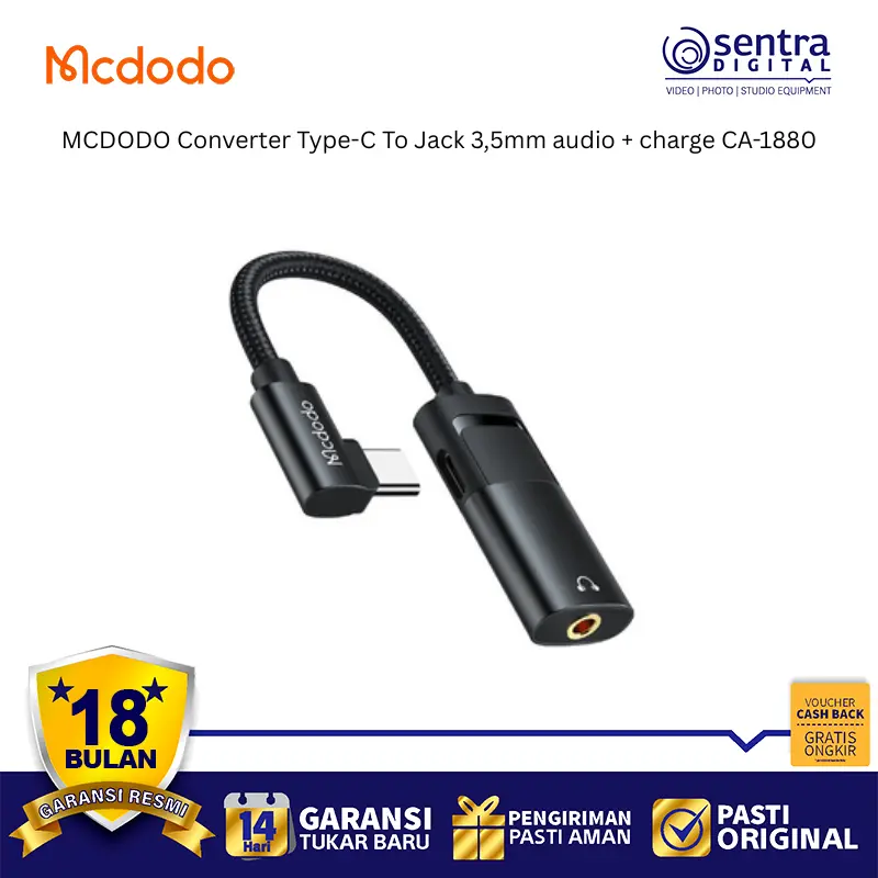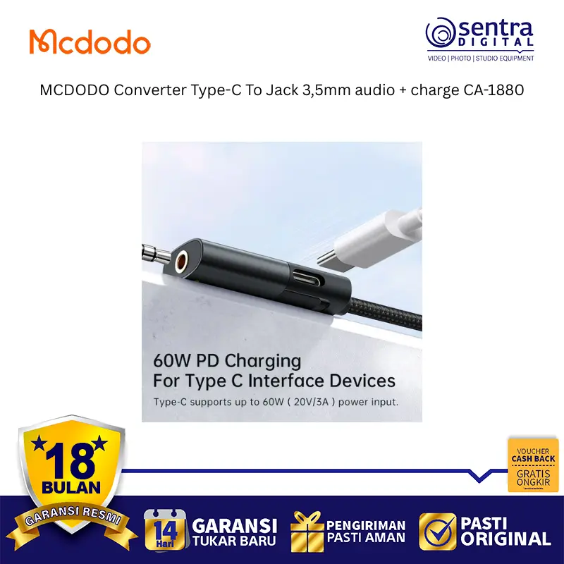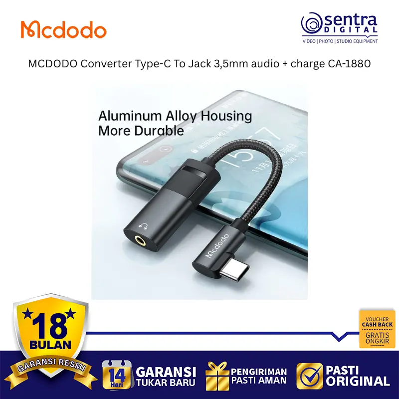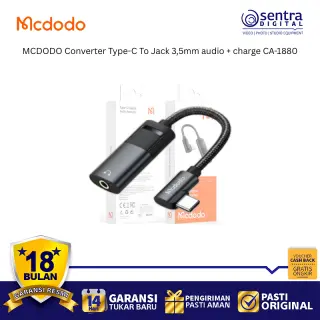 MCDODO Converter Type-C To Jack 3,5mm audio + charge CA-1880 adalah adapter splitter 2-in-1 yang memungkinkan pengguna perangkat dengan port USB Type-C tunggal untuk mendengarkan musik atau melakukan panggilan melalui headphone jack 3,5mm sambil mengisi daya secara bersamaan. Konverter ini mendukung pengisian daya cepat Power Delivery (PD) hingga 60W dan dilengkapi dengan chip decoding audio digital canggih untuk menjamin kualitas suara resolusi tinggi tanpa kebisingan (lossless transmission). Desainnya menggunakan material paduan aluminium yang dilapisi kabel nylon braided untuk daya tahan yang kuat, menjadikannya solusi praktis dan plug and play untuk perangkat mobile modern.