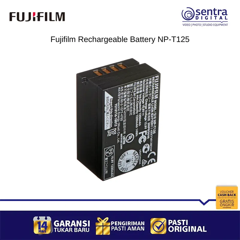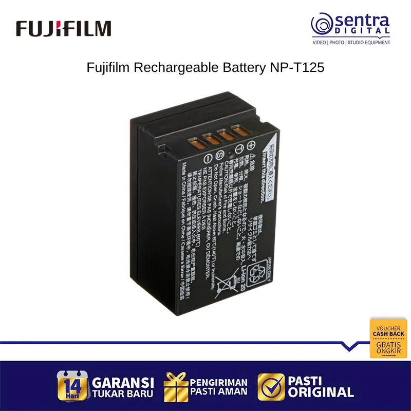 FUJIFILM NP-T125 Rechargeable Battery adalah baterai Lithium-Ion isi ulang yang dirancang secara khusus sebagai sumber daya utama untuk jajaran kamera mirrorless format medium FUJIFILM GFX Series, termasuk model seperti GFX 50S, GFX 50R, dan GFX 100. Baterai ini memiliki kapasitas sekitar 1230 mAh dengan tegangan 10.8V dan berfungsi sebagai unit cadangan atau pengganti untuk memastikan sesi pengambilan gambar yang panjang dapat terus berlanjut tanpa terganggu kehabisan daya. Sebagai baterai original, NP-T125 menjamin kompatibilitas dan kinerja optimal untuk memenuhi kebutuhan daya tinggi dari kamera medium format profesional Fujifilm.