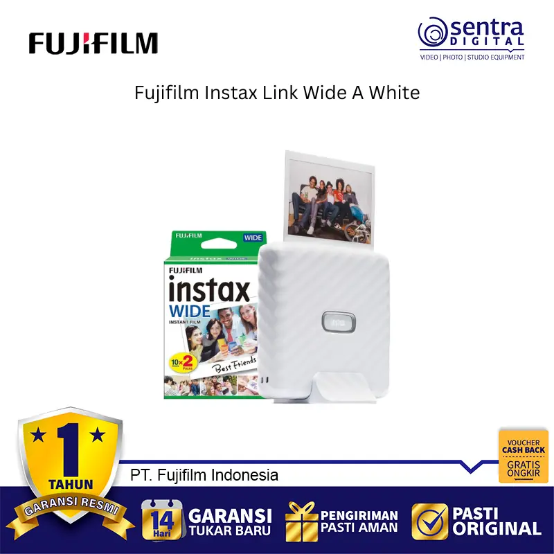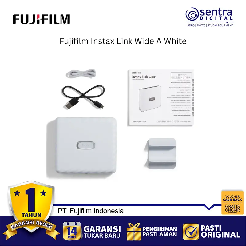 Fujifilm Instax Link Wide A White EX D adalah printer foto portabel yang dirancang untuk mencetak gambar format Instax Wide langsung dari ponsel pintar Anda melalui koneksi Bluetooth. Printer yang ramping dan ringkas ini memiliki desain berwarna Ash White dan menawarkan dua mode kualitas cetak, yaitu "instax-Natural Mode" untuk tampilan yang lebih klasik dan lembut, serta "instax-Rich Mode" untuk warna yang lebih cerah dan kaya kontras.