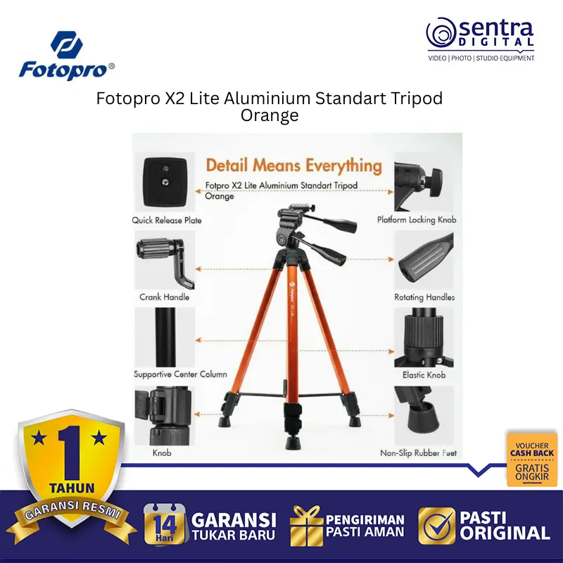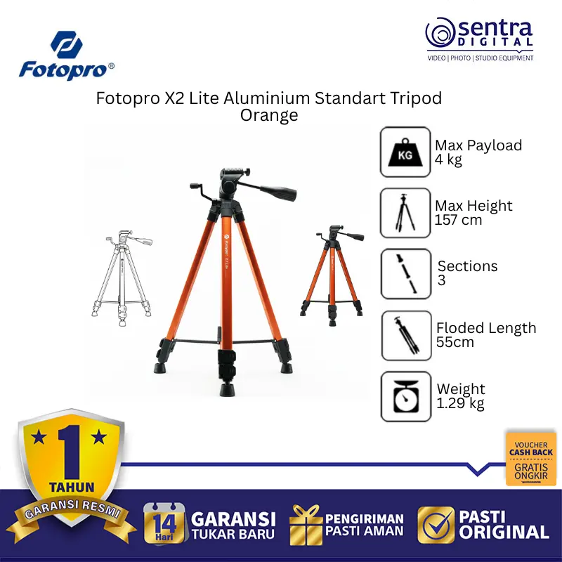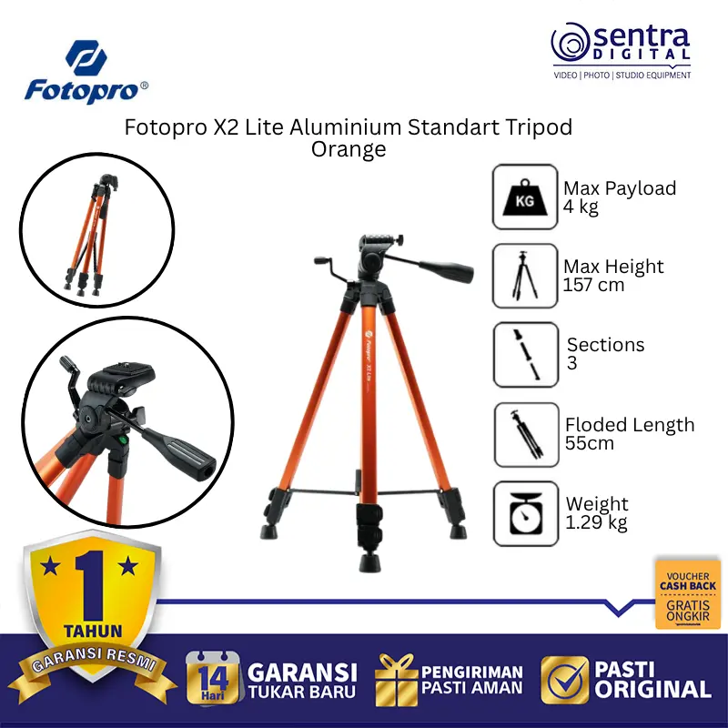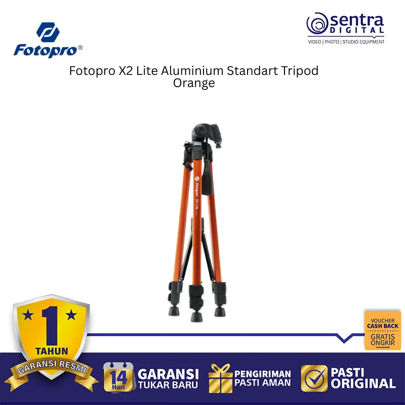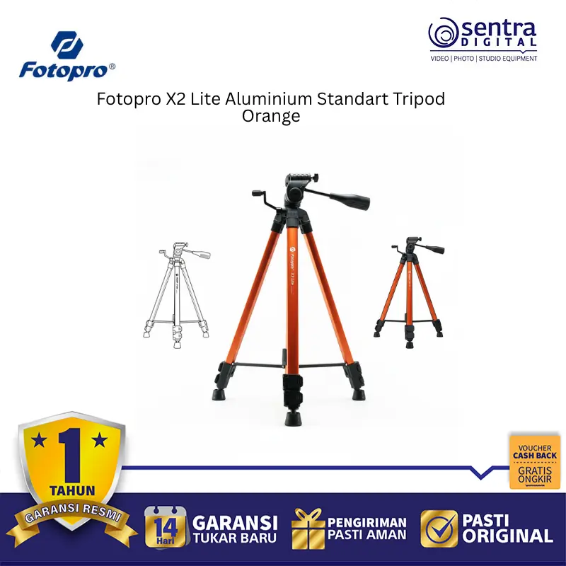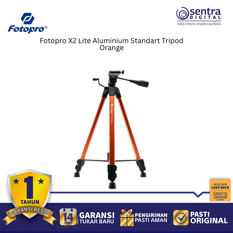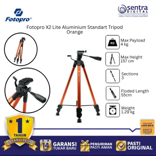 Fotopro X2 Lite Aluminium Tripod Orange adalah tripod standar ringan berbahan aluminium dengan desain lipat dan warna oranye cerah. Dilengkapi kepala 3-way pan, kaki anti-slip, dan tinggi maksimal hingga 120 cm, cocok untuk kamera DSLR, mirrorless, dan smartphone. Ideal untuk fotografi harian, konten kreatif, dan traveling.