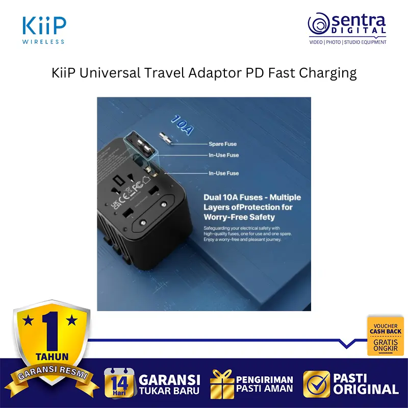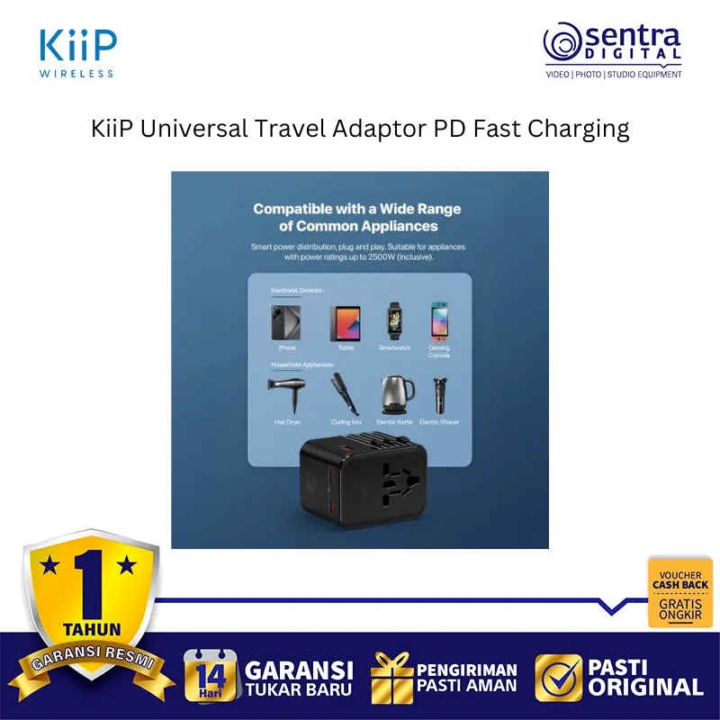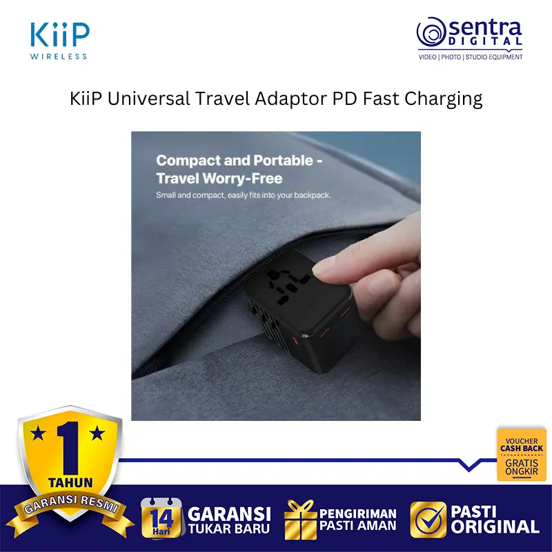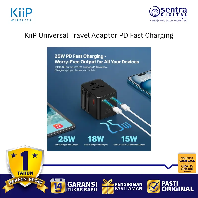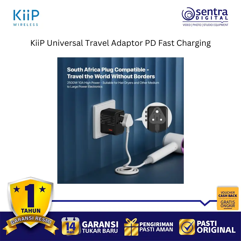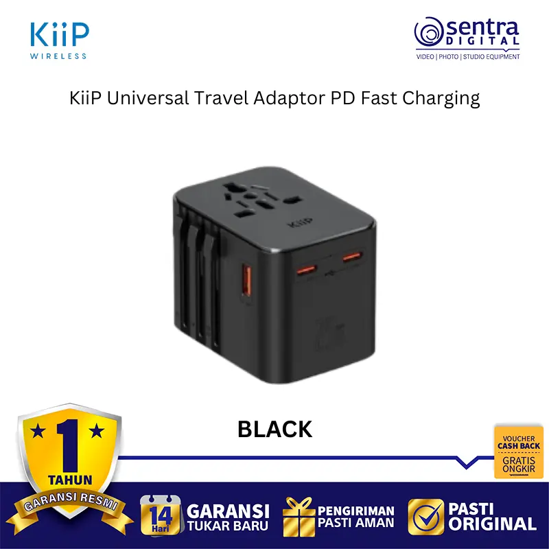 KiiP C27T adalah adaptor perjalanan universal yang ringkas dan portabel dengan dukungan Pengisian Cepat PD (Power Delivery), umumnya hingga 25W (terkadang juga disebut 20W atau 35W tergantung varian atau port yang digunakan), yang dirancang untuk pengisian daya cepat perangkat seperti smartphone dan tablet. Adaptor ini memiliki desain kombinasi colokan yang mencakup standar EU, USA, AUS, dan UK, memungkinkannya digunakan di lebih dari 150 negara. Adaptor ini dilengkapi dengan beberapa port pengisian cepat yang terdiri dari dua port Type-C (maksimal 25W per port dalam skenario tertentu) dan satu port USB-A (maksimal 18W), yang mendukung protokol pengisian cepat seperti PD 3.0, QC 3.0, dan PPS. Dibuat dari bahan tahan api PC, adaptor ini juga memiliki fitur keamanan seperti sekring ganda 10A dan mendukung input tegangan lebar AC 100-240V, menjadikannya solusi pengisian daya yang aman, serbaguna, dan efisien untuk perjalanan global.