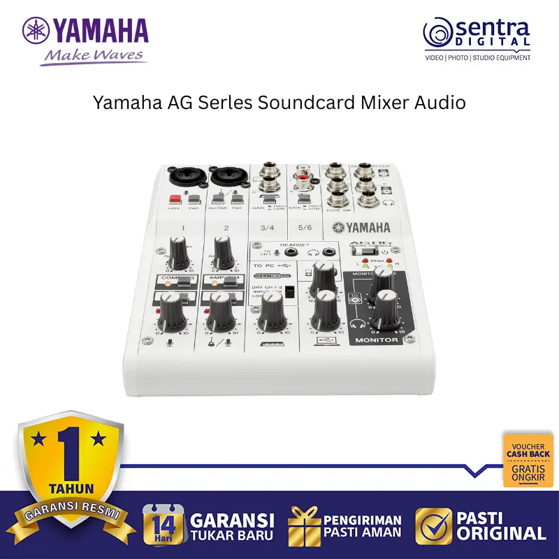 Yamaha AG06 MK2 adalah mixer dan audio interface USB 6-saluran ringkas yang dirancang khusus untuk kebutuhan live streaming, podcast, gaming, dan produksi musik portabel, tersedia juga dalam warna putih yang elegan. Perangkat ini berfungsi sebagai solusi all-in-one yang menggabungkan kontrol mixer analog intuitif dengan kemampuan perekaman digital beresolusi tinggi (24-bit/192kHz). Fitur utamanya mencakup fungsi LOOPBACK yang memudahkan pencampuran audio dari mikrofon, instrumen, dan musik playback komputer secara real-time untuk siaran langsung yang mulus, dua input combo XLR dengan phantom power +48V untuk penggunaan dua mikrofon kondensor sekaligus, serta satu input Hi-Z untuk gitar. AG06 MK2 juga dilengkapi preamp mikrofon D-PRE berkualitas tinggi dan efek DSP bawaan 1-TOUCH seperti Comp/EQ, Reverb, dan Amp Simulator yang dapat diaplikasikan tanpa latensi. Dengan koneksi USB-C, perangkat ini menawarkan transfer data yang stabil dan kompatibilitas yang luas dengan PC, Mac, iOS, dan Android, menjadikannya alat yang sangat fleksibel untuk kreator konten modern.