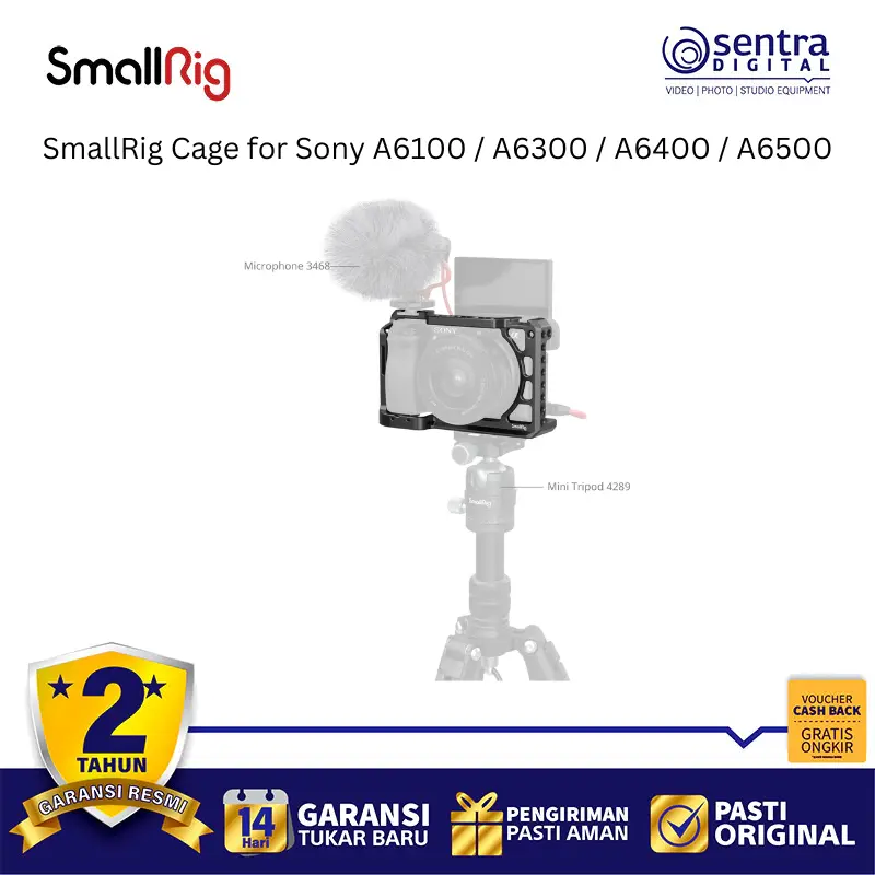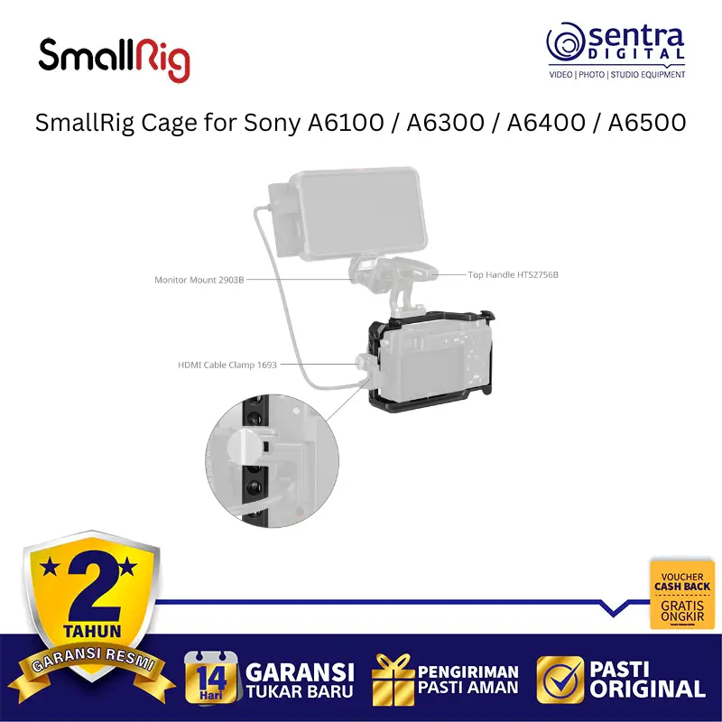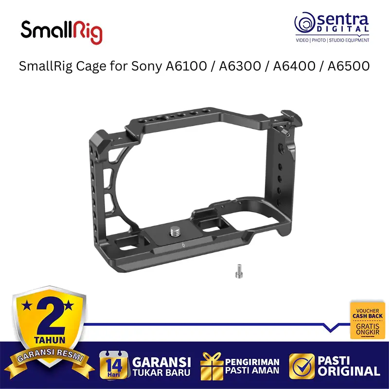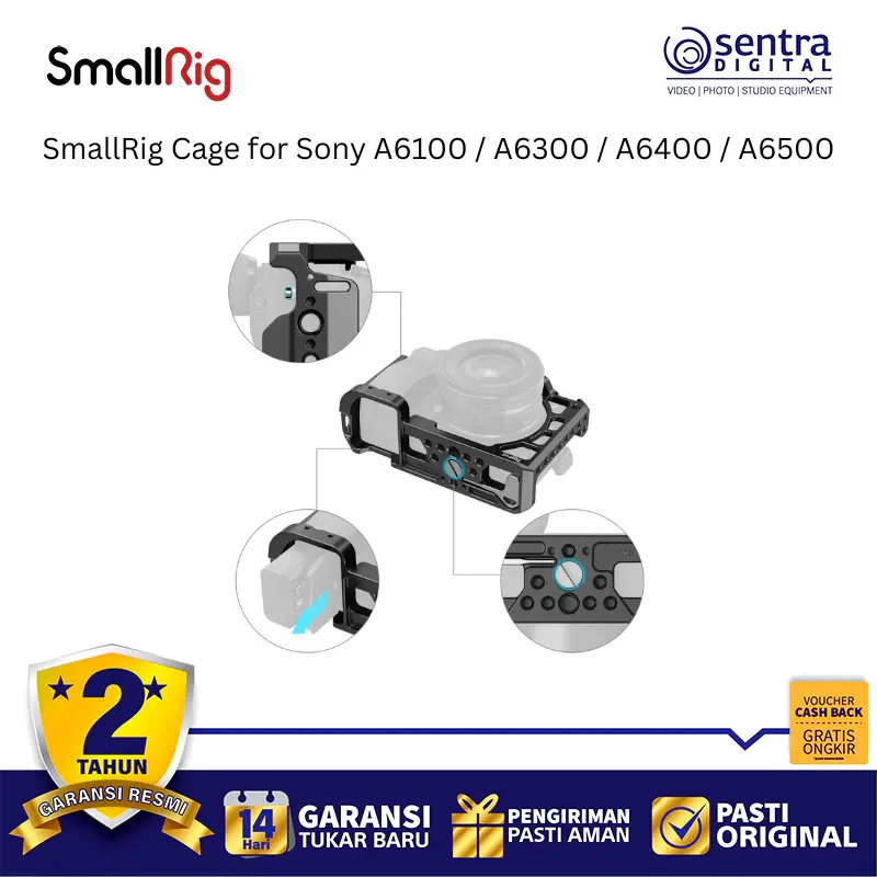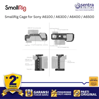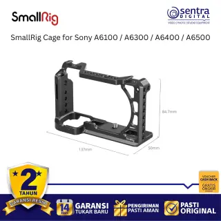 SmallRig Cage for Sony A6100 / A6300 / A6400 / A6500 (CCS2310C) adalah kerangka pelindung berbahan paduan aluminium yang dirancang presisi untuk membungkus bodi kamera tanpa menghalangi akses ke tombol, port, maupun kompartemen baterai. Cage ini berfungsi sebagai pelindung sekaligus menyediakan berbagai titik pemasangan aksesori seperti lubang sekrup 1/4-20, 3/8-16, lubang pencari ARRI, dan dua buah dudukan cold shoe untuk memasang mikrofon atau lampu LED secara bersamaan.