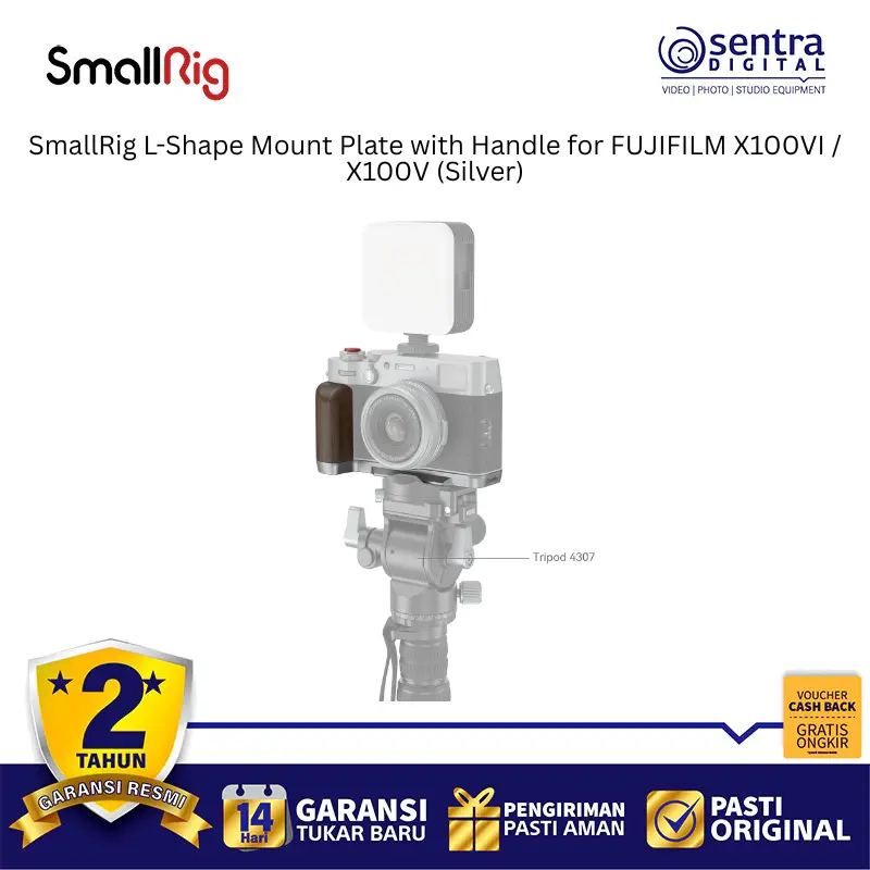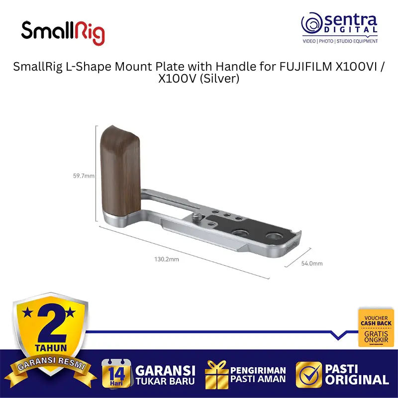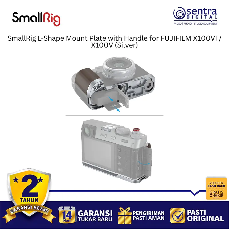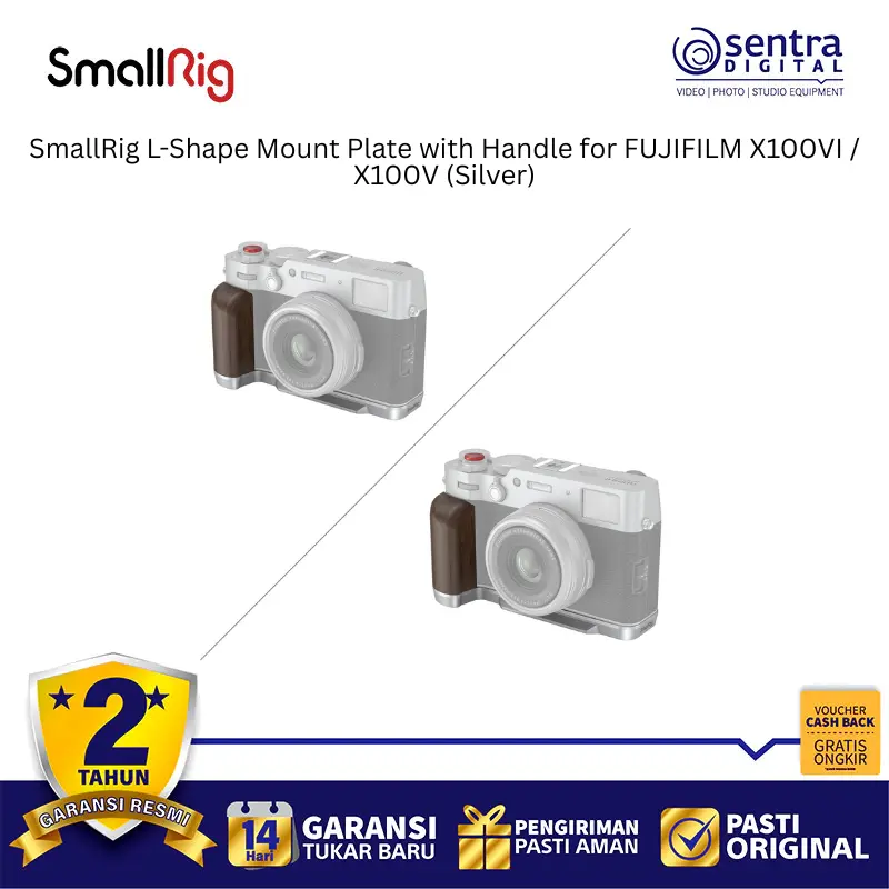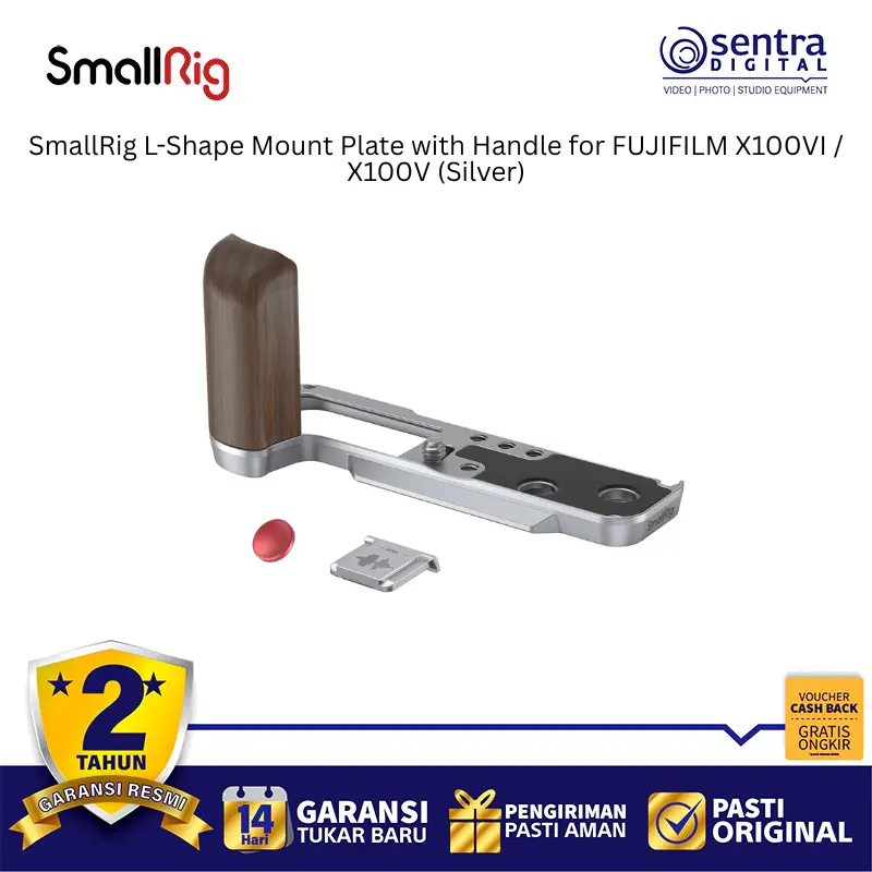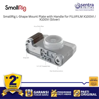 SmallRig 4804 adalah pelat dudukan berbentuk L berwarna perak yang dirancang secara khusus untuk kamera Fujifilm X100VI dan X100V guna meningkatkan kenyamanan genggaman serta fleksibilitas pemakaian. Aksesori ini memiliki pegangan ergonomis yang menyatu dengan bodi kamera dan dilengkapi dengan pelat pelepas cepat tipe Arca-Swiss di bagian bawah untuk memudahkan pemasangan ke tripod secara instan. Desainnya yang presisi memastikan pengguna tetap memiliki akses penuh ke pintu baterai, slot kartu memori, serta layar kamera tanpa hambatan sedikit pun. Selain itu, pelat ini dilengkapi dengan dudukan cold shoe di bagian samping untuk mikrofon atau lampu, serta lubang tali untuk pemasangan strap. Paket penjualannya juga menyertakan tombol pelepas rana eksklusif yang menambah estetika sekaligus kenyamanan saat menekan tombol shutter.