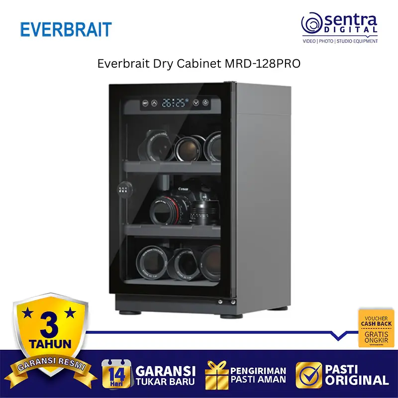Everbrait Dry Cabinet MRD-75PRO merupakan lemari penyimpanan elektronik berkapasitas 70 liter yang dirancang khusus untuk melindungi kamera, lensa, dan barang berharga lainnya dari kerusakan akibat jamur serta korosi yang dipicu oleh kelembapan udara. Sebagai varian Pro, kabinet ini dilengkapi dengan fitur keamanan canggih berupa pengunci sandi numerik dan panel kontrol layar sentuh LCD yang memudahkan pengguna mengatur kelembapan secara otomatis dan presisi. Unit ini memiliki bodi baja yang kokoh dengan pintu kaca temper transparan dan bingkai aluminium, serta beroperasi sangat senyap dengan konsumsi daya yang sangat efisien yakni maksimal 10 watt. Di bagian interiornya, tersedia dua rak yang dapat disesuaikan ketinggiannya serta lampu LED internal yang mempermudah pemantauan koleksi peralatan Anda tanpa harus membuka pintu.