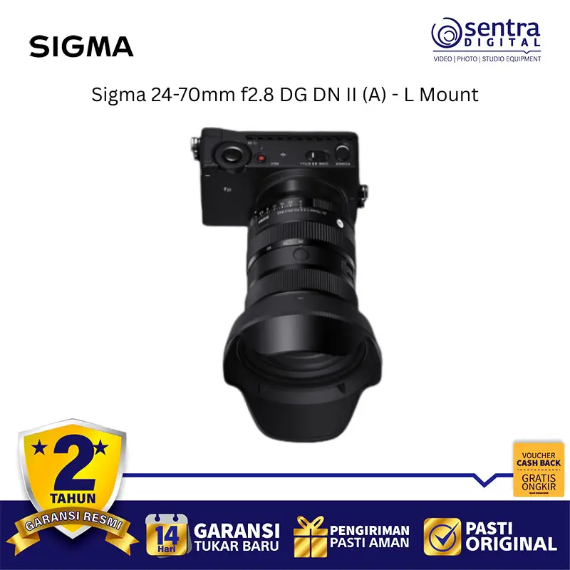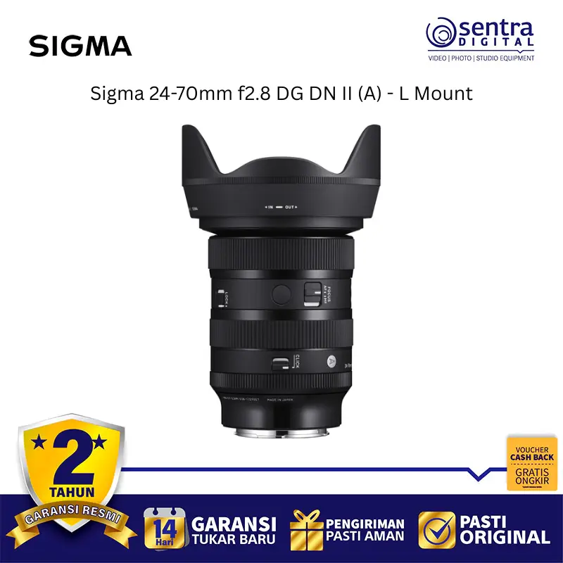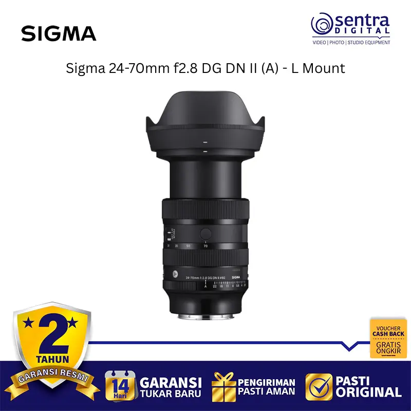 Sigma 24-70mm f/2.8 DG DN II Art adalah lensa zoom standar flagship yang dirancang khusus untuk sistem mirrorless full-frame L-Mount dengan peningkatan signifikan pada ketajaman dan portabilitas. Lensa ini hadir dengan bodi yang lebih ringkas dan bobot sekitar 10 persen lebih ringan dibandingkan generasi sebelumnya, menjadikannya pilihan ideal untuk penggunaan harian maupun profesional. Ditenagai oleh motor linear HLA, sistem autofokusnya bekerja tiga kali lebih cepat dan sangat senyap, sehingga sangat mendukung kebutuhan fotografi aksi maupun perekaman video yang minim gangguan suara. Kualitas optiknya menawarkan resolusi tinggi dari tengah hingga tepi bingkai berkat penggunaan elemen kaca canggih yang meminimalisir berbagai jenis aberasi. Fitur tambahan seperti cincin aperture manual dengan switch klik atau de-klik, dua tombol AFL yang dapat diprogram, serta ketahanan terhadap debu dan cipratan air memberikan fleksibilitas serta durabilitas tinggi di berbagai kondisi pemotretan.