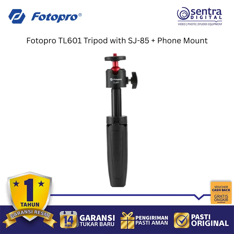 Fotopro TL601 dengan dudukan ponsel SJ-85+ adalah tripod meja multifungsi yang juga dapat beralih fungsi menjadi tongkat swafoto ringkas, dirancang khusus untuk mempermudah mobilitas kreator konten. Perangkat ini memiliki desain ultra-portabel dengan berat hanya 92 gram dan panjang lipat sekitar 14,6 cm, sehingga sangat mudah dibawa di dalam saku atau tas kecil. Meskipun mungil, tripod ini mampu menahan beban hingga 1,5 kg dan memiliki kaki-kaki kokoh yang dapat diperpanjang secara teleskopik hingga ketinggian maksimal 24,3 cm. Paket ini sudah dilengkapi dengan holder ponsel SJ-85+ berwarna hitam elegan yang mendukung posisi pemotretan vertikal maupun horizontal serta memiliki bantalan pelindung anti-selip untuk menjaga keamanan perangkat Anda. Dengan kepala bola yang fleksibel untuk rotasi penuh dan sudut kemiringan yang luas, tripod ini menjadi solusi praktis untuk konferensi video, vlogging, maupun pengambilan foto stabil di mana saja.