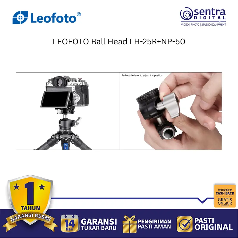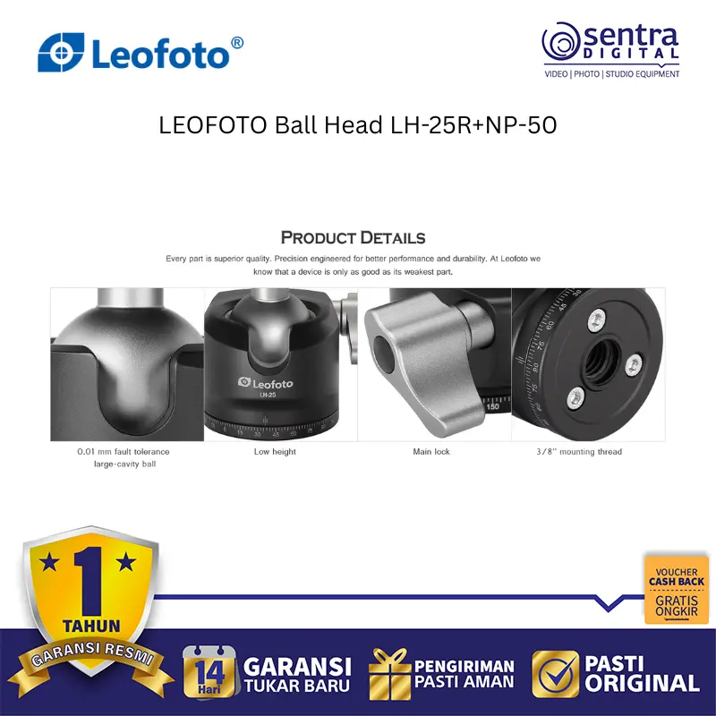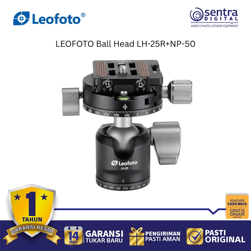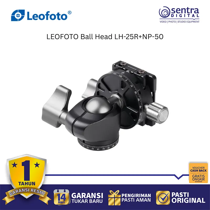 Leofoto Ballhead LH-25R+NP-50 adalah kepala tripod tipe bola yang dirancang dengan profil rendah dan material aluminium berkualitas tinggi untuk memberikan stabilitas maksimal dalam bentuk yang sangat mungil. Perangkat ini memiliki keunggulan pada sistem penguncian ganda yang kuat serta fitur panorama pada bagian atas platform, memungkinkan fotografer melakukan rotasi horizontal 360 derajat secara mulus bahkan saat posisi bola terkunci. Paket ini sudah termasuk