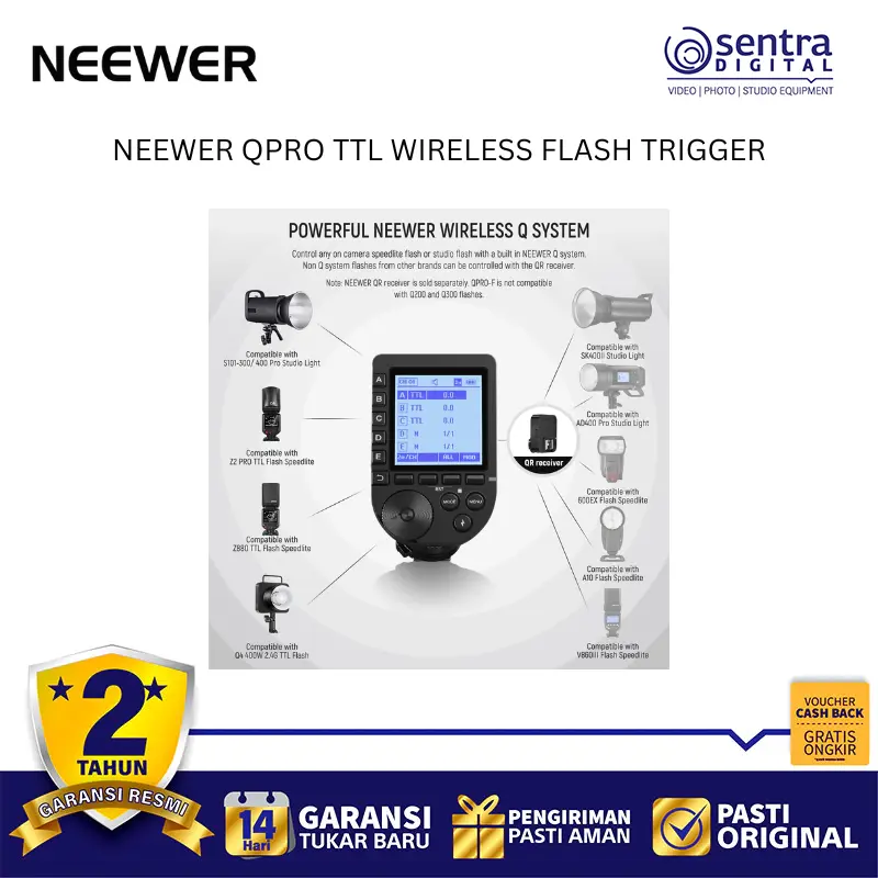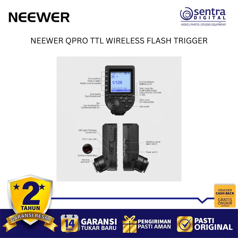 Neewer QPRO TTL Wireless Trigger adalah pemicu lampu kilat nirkabel profesional yang menggunakan sistem frekuensi 2.4 GHz untuk pengendalian cahaya yang stabil hingga jarak 100 meter. Perangkat ini mendukung berbagai mode canggih mulai dari TTL Autoflash, Manual, hingga Multi Flash, serta dilengkapi fitur sinkronisasi kecepatan tinggi atau High-Speed Sync hingga 1/8000 detik. Dengan layar LCD besar yang memiliki lampu latar dan antarmuka yang miring, pengguna dapat dengan mudah memantau serta mengatur hingga 5 grup dan 32 saluran secara bersamaan. Unit ini juga memiliki fitur tambahan seperti bantuan fokus, kontrol lampu pemodelan, serta port USB-C untuk pembaruan perangkat lunak, menjadikannya pusat kendali yang sangat fleksibel bagi fotografer yang menggunakan sistem kamera Canon, Nikon, Sony, maupun Fujifilm.