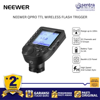 Neewer QPRO TTL Wireless Trigger adalah pemicu lampu kilat nirkabel profesional yang menggunakan sistem frekuensi 2.4 GHz untuk pengendalian cahaya yang stabil hingga jarak 100 meter. Perangkat ini mendukung berbagai mode canggih mulai dari TTL Autoflash, Manual, hingga Multi Flash, serta dilengkapi fitur sinkronisasi kecepatan tinggi atau High-Speed Sync hingga 1/8000 detik. Dengan layar LCD besar yang memiliki lampu latar dan antarmuka yang miring, pengguna dapat dengan mudah memantau serta mengatur hingga 5 grup dan 32 saluran secara bersamaan. Unit ini juga memiliki fitur tambahan seperti bantuan fokus, kontrol lampu pemodelan, serta port USB-C untuk pembaruan perangkat lunak, menjadikannya pusat kendali yang sangat fleksibel bagi fotografer yang menggunakan sistem kamera Canon, Nikon, Sony, maupun Fujifilm.