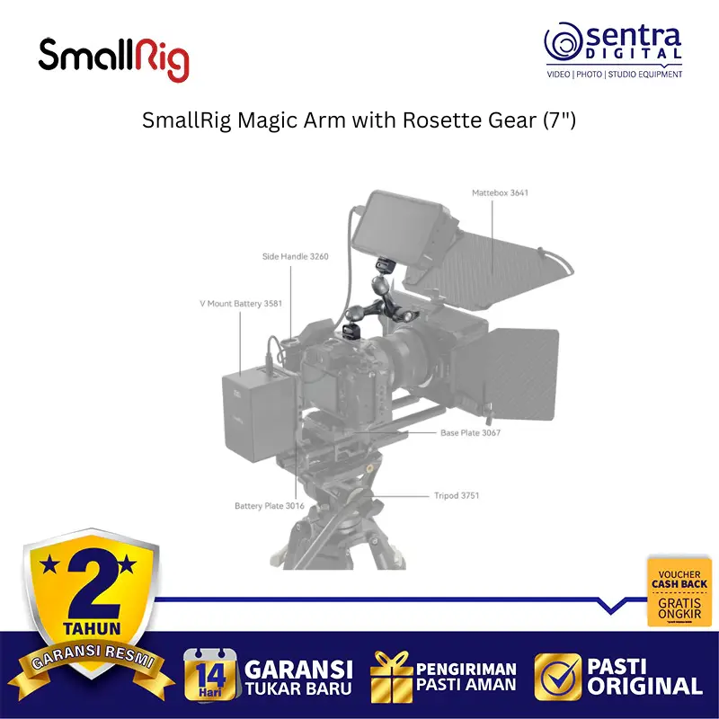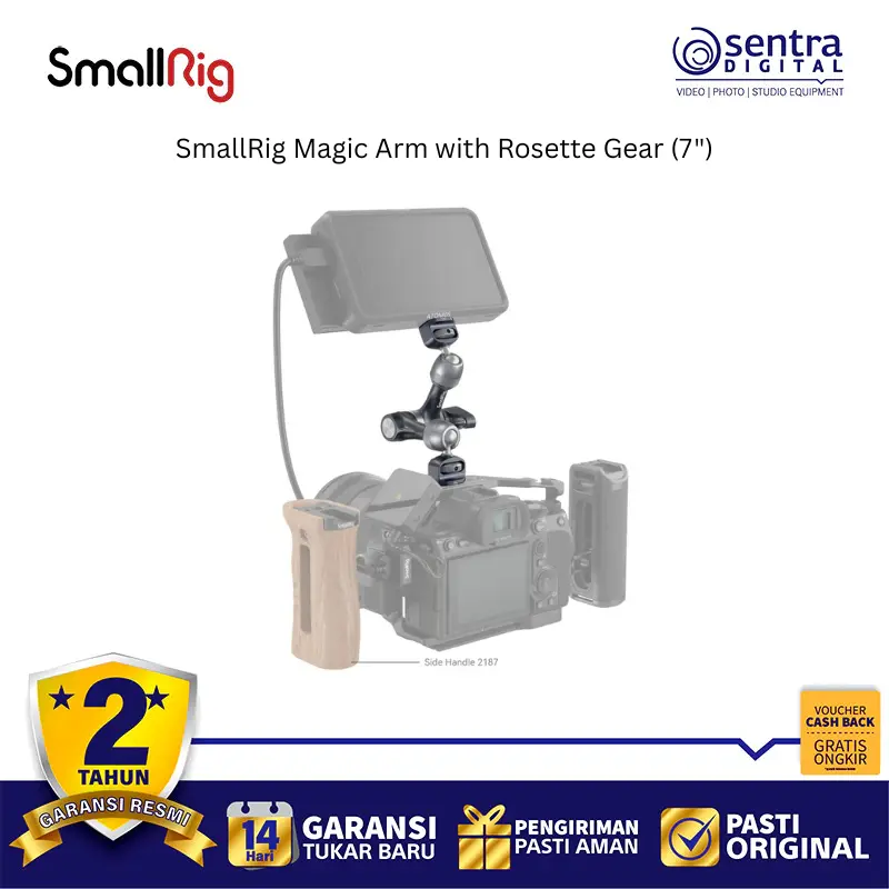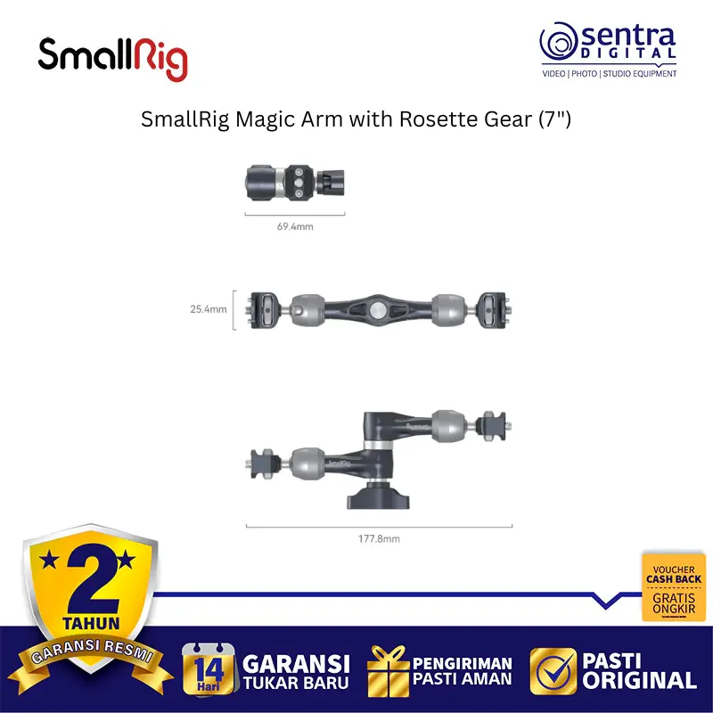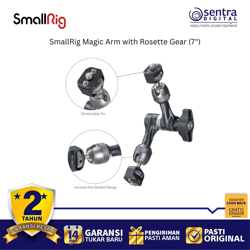 SmallRig Magic Arm with Rosette Gear 4194 adalah lengan artikulasi sepanjang 7 inci yang dirancang untuk memasang aksesori kamera seperti monitor, lampu LED, atau mikrofon dengan stabilitas tinggi. Terbuat dari paduan aluminium tingkat pesawat dan baja tahan karat, alat ini menggunakan sistem pengunci