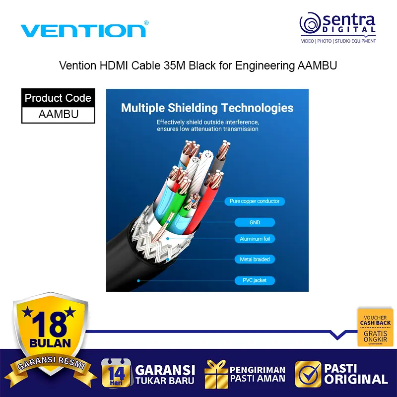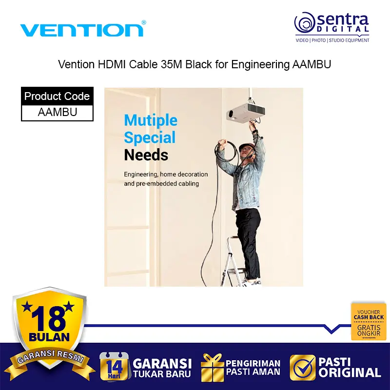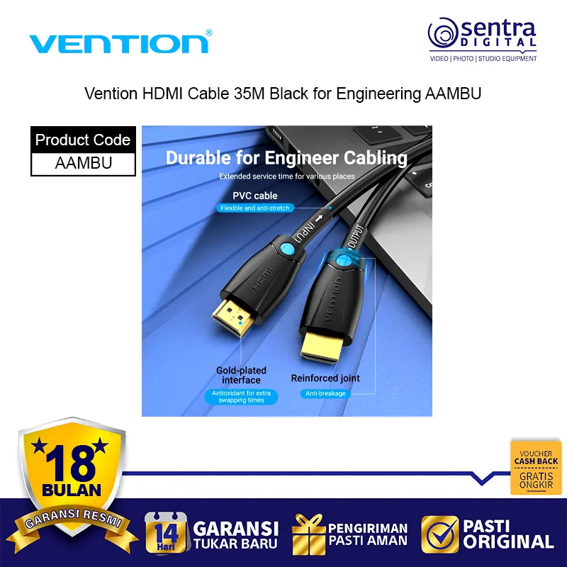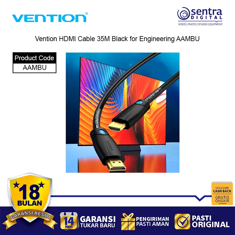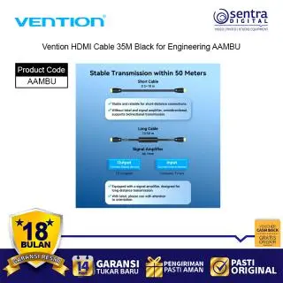 Vention HDMI Cable 35M Black for Engineering AAMBU adalah kabel HDMI profesional dengan panjang ekstra 35 meter, dirancang khusus untuk kebutuhan instalasi teknik, konferensi, dan sistem audio visual berskala besar. Kabel ini mendukung resolusi hingga 4K Ultra HD dengan transmisi sinyal stabil, cocok untuk digunakan pada proyektor, layar besar, TV, dan perangkat presentasi. Terbuat dari material PVC hitam yang kuat dan fleksibel, kabel ini memastikan kualitas gambar jernih tanpa gangguan meski digunakan pada jarak jauh.