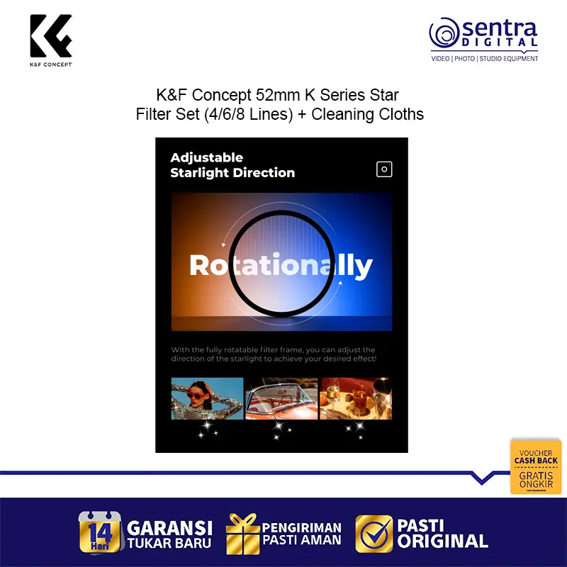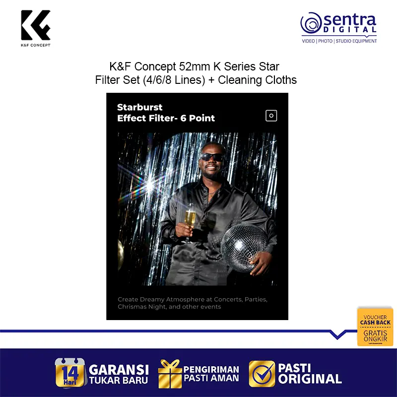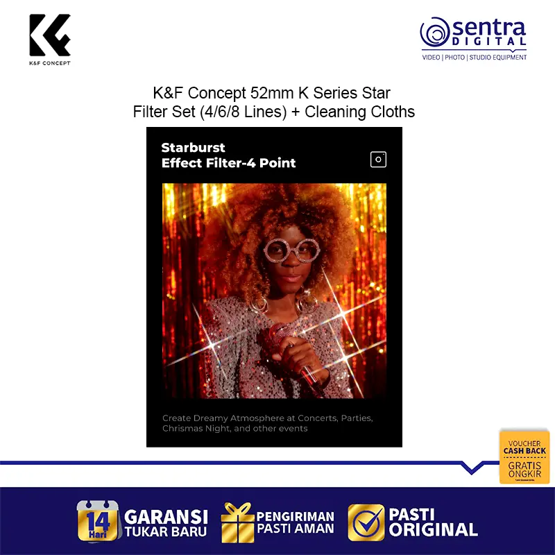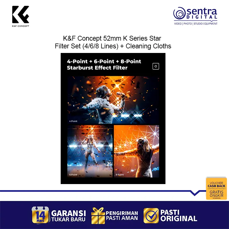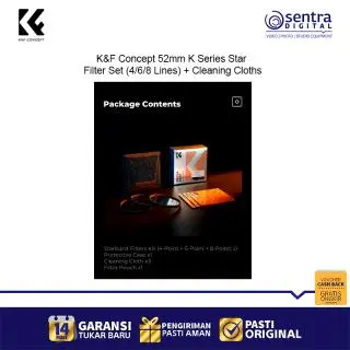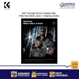 The K&F Concept 52mm K Series Star Filter Set (SKU.2128V1) is designed for photographers who want to add sparkle and drama to their shots. With three star filters (4-lines, 6-lines, and 8-lines), you can create stunning starburst effects around light sources, perfect for night photography, jewelry, and creative portraits. Featuring a durable 18-layer green coating for superior clarity and protection, plus three cleaning cloths for easy maintenance, this set is a must-have accessory for creative shooters.