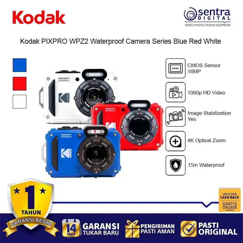 Kodak PIXPRO WPZ2 adalah kamera digital tangguh yang dirancang khusus untuk petualangan luar ruangan berkat kemampuannya yang tahan air hingga kedalaman 15 meter, tahan guncangan dari ketinggian 2 meter, dan tahan terhadap debu. Kamera ini dilengkapi dengan sensor BSI CMOS 16 megapiksel yang mampu menghasilkan foto detail dan rekaman video Full HD 1080p dengan performa baik dalam kondisi cahaya rendah. Fitur zoom optik 4x dan konektivitas Wi-Fi terintegrasi memudahkan pengguna untuk menangkap momen dari jarak jauh serta membagikannya langsung ke perangkat pintar. Dengan desain yang ergonomis dan antarmuka yang ramah pengguna, kamera ini menjadi pilihan ideal bagi keluarga maupun individu yang membutuhkan perangkat dokumentasi tangguh untuk aktivitas ekstrem seperti snorkeling atau mendaki tanpa perlu khawatir akan kerusakan lingkungan.