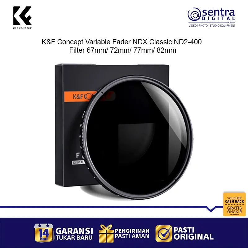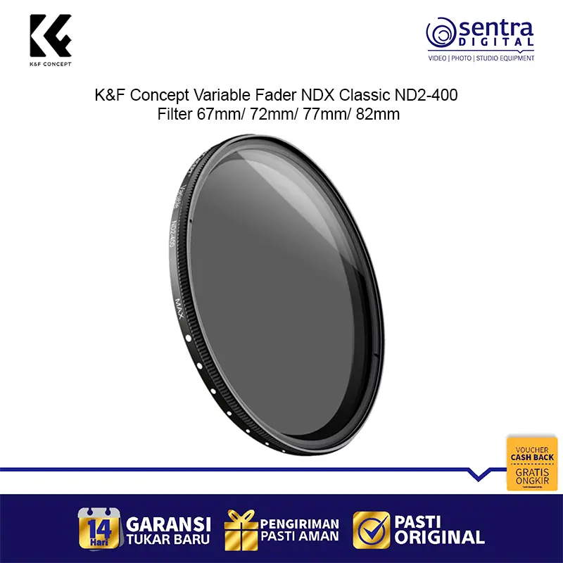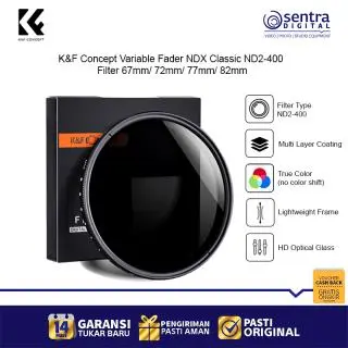 K&F Concept 67mm Variable Fader NDX Classic ND2-400 – Filter ND profesional dengan rentang ND2 hingga ND400, desain slim frame anti-vignetting, kompatibel dengan lensa 67mm, ideal untuk fotografi landscape, long exposure, dan videografi dengan kontrol cahaya maksimal.
