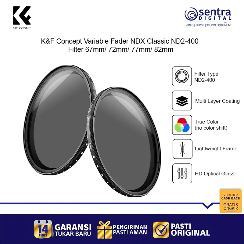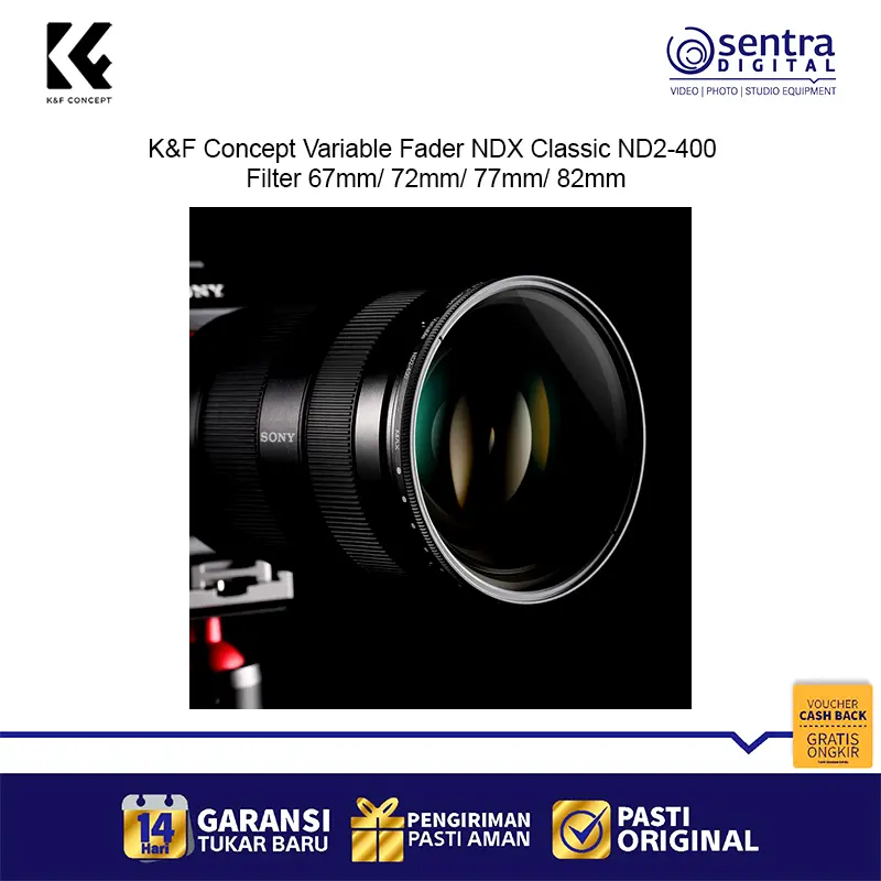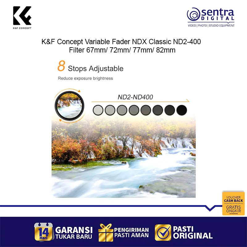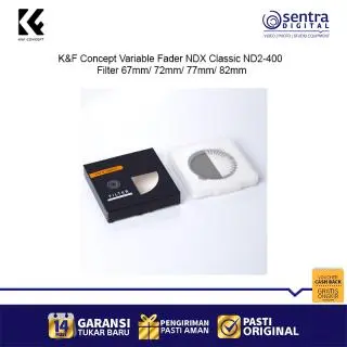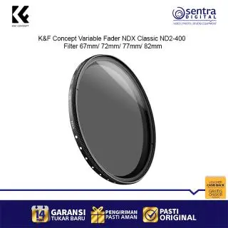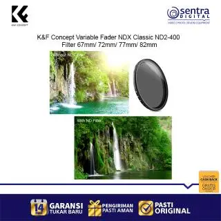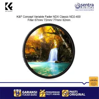 K&F Concept 82mm Variable Fader NDX Classic ND2-400 – Filter ND variabel profesional dengan rentang ND2 hingga ND400, desain slim frame anti-vignetting, kompatibel dengan lensa 82mm, ideal untuk fotografi landscape, long exposure, dan videografi dengan kontrol cahaya presisi.