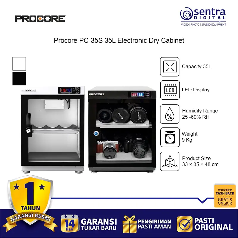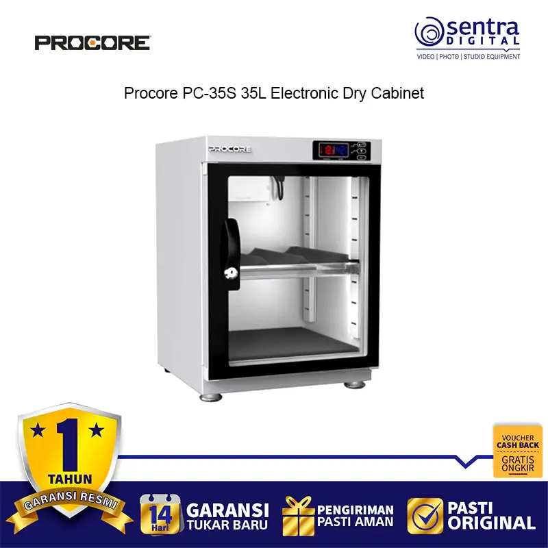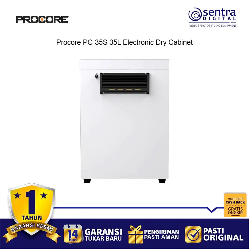 Procore PC-35S 35L Electronic Dry Cabinet adalah lemari penyimpanan elektronik berkapasitas 35 liter yang dirancang khusus untuk melindungi peralatan fotografi dan elektronik sensitif dari kerusakan akibat jamur, karat, dan kelembapan tinggi. Menggunakan teknologi pendinginan termoelektrik yang efisien dan tidak berisik, perangkat ini mampu mengatur tingkat kelembapan secara presisi melalui kontrol digital yang mudah dipantau lewat layar LCD di bagian depan. Struktur fisiknya terbuat dari baja canai dingin yang kokoh dengan pintu kaca temper kedap udara yang dilengkapi kunci pengaman untuk memberikan perlindungan fisik ekstra. Di bagian dalam, terdapat rak yang dapat disesuaikan ketinggiannya serta bantalan busa lembut untuk menjaga lensa, bodi kamera, dan media penyimpanan tetap aman serta terorganisir dengan baik dalam lingkungan yang kering dan terkendali.