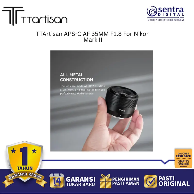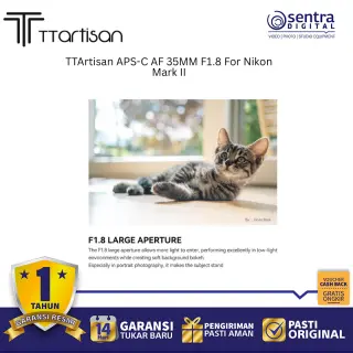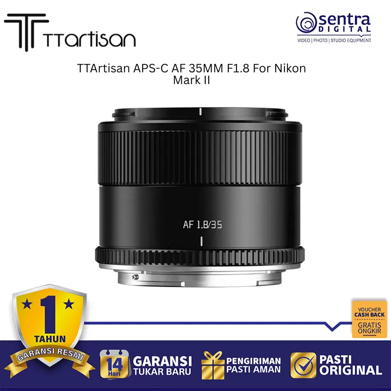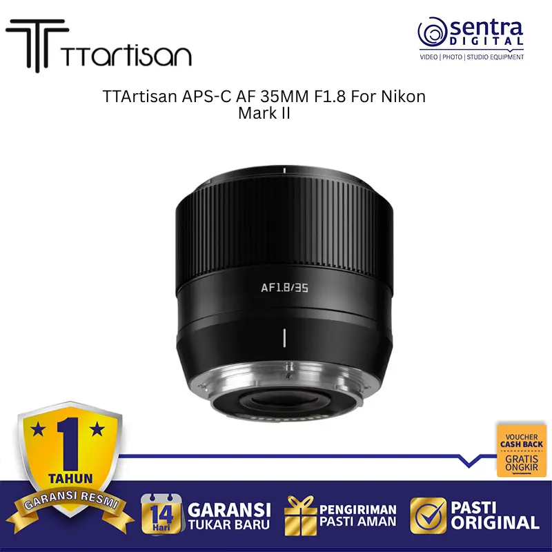 TTArtisan APS-C AF 35mm F1.8 adalah lensa prime dengan autofokus cepat dan bukaan F1.8 yang terang, dirancang khusus untuk kamera Nikon Z Mount Mark II. Dengan desain ringkas dan bobot ringan, lensa ini ideal untuk fotografi jalanan, potret, maupun harian, menghasilkan gambar tajam dengan bokeh halus.
