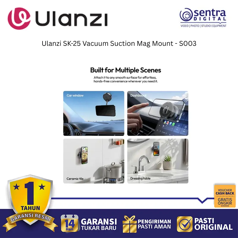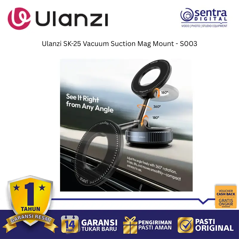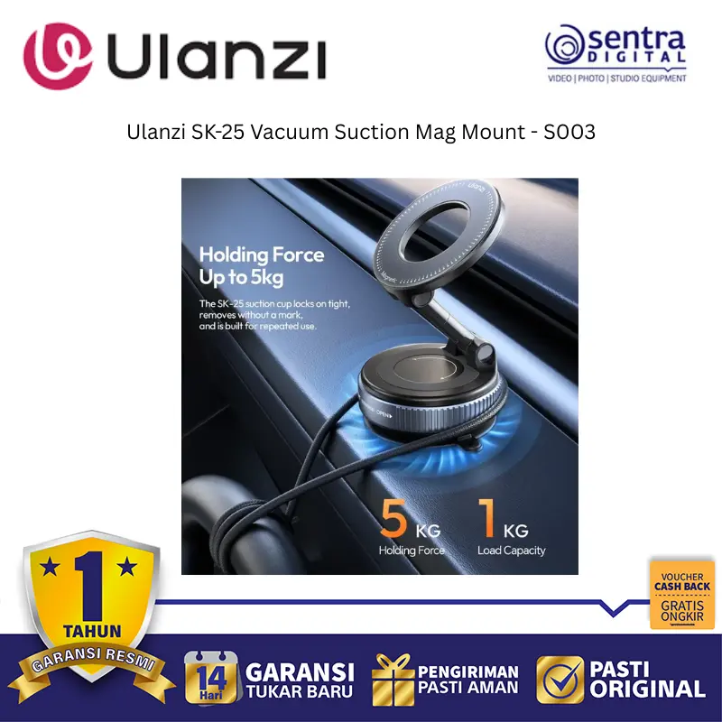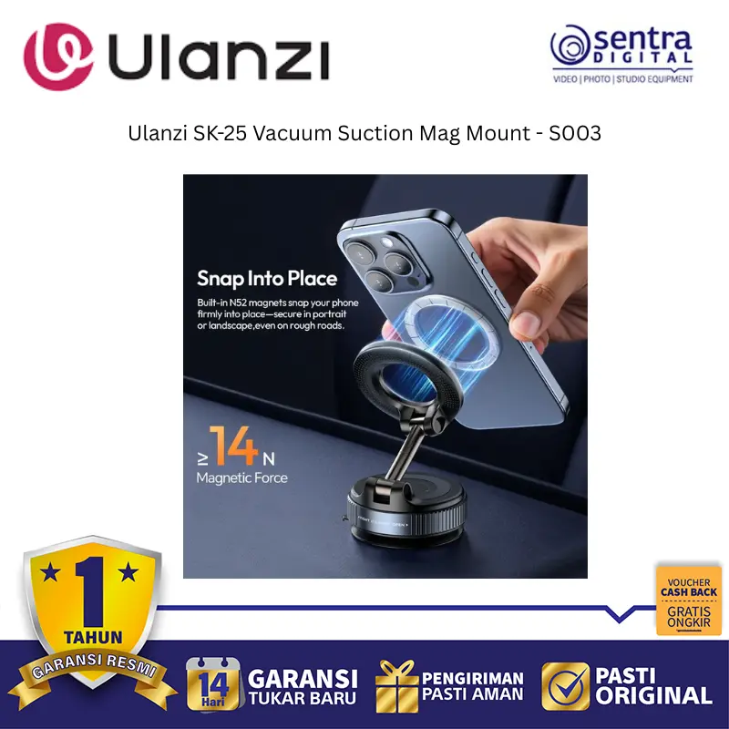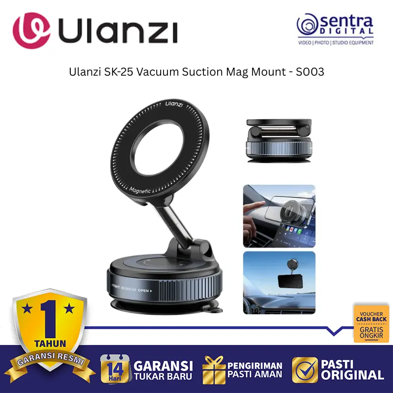 Ulanzi SK-25 adalah dudukan magnetik dengan sistem vakum kuat yang mampu menempel stabil di permukaan datar seperti kaca, logam, atau mobil.