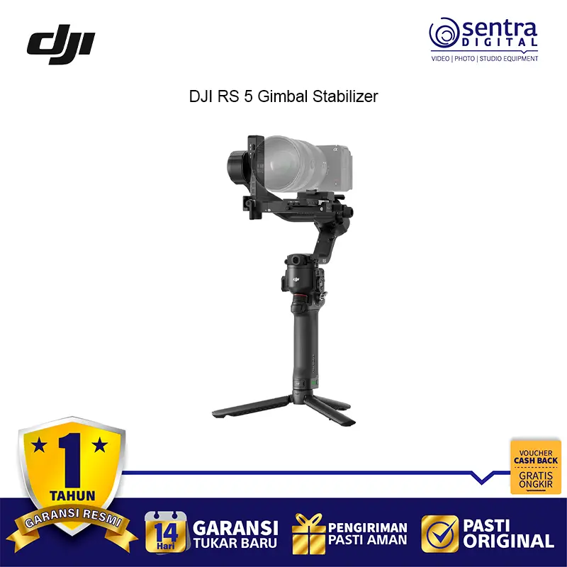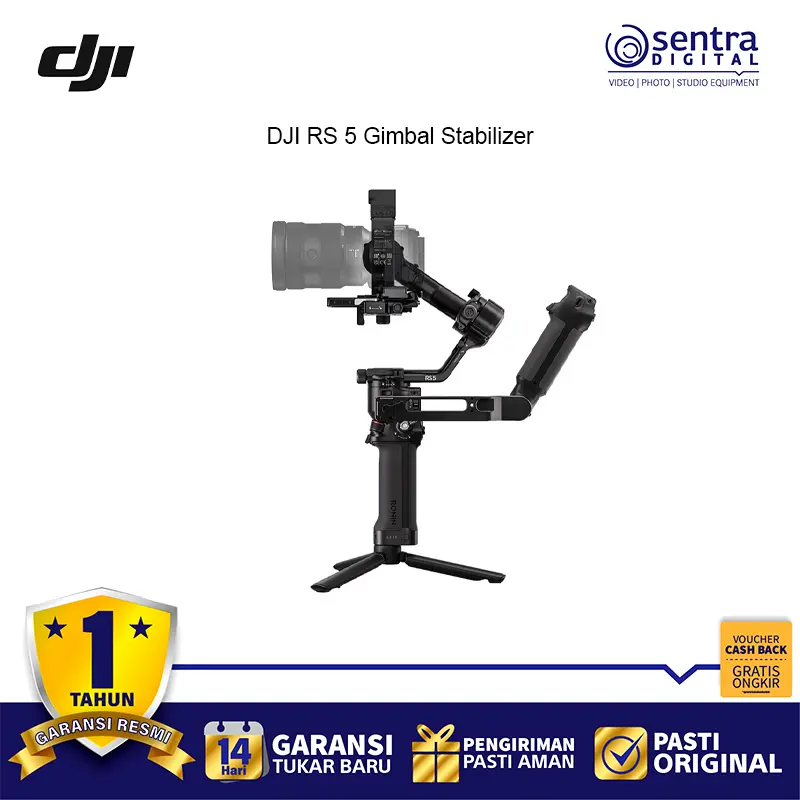 DJI RS 5 tetap membawa identitas khas seri RS dengan desain industrial yang terlihat solid dan profesional. Material metal berfinishing hitam matte memberi kesan kokoh sekaligus elegan sehingga cocok untuk penggunaan profesional. Walau tampil tangguh, bobotnya tetap terasa seimbang sehingga nyaman dipakai dalam durasi pengambilan gambar yang panjang.