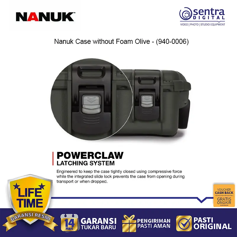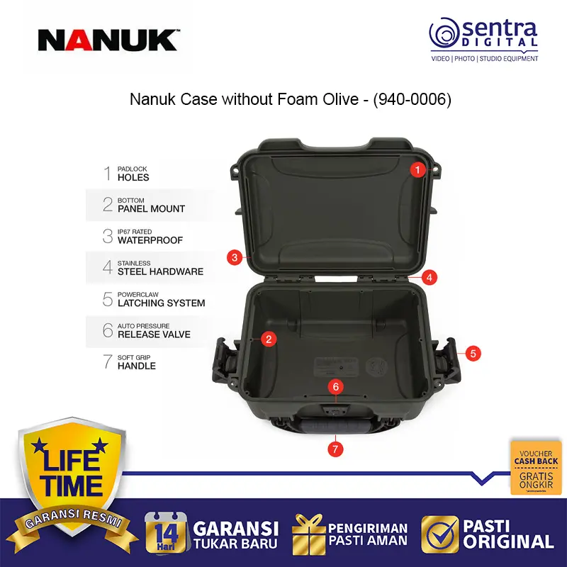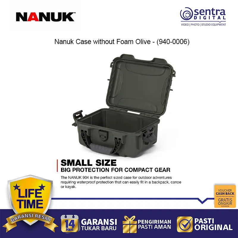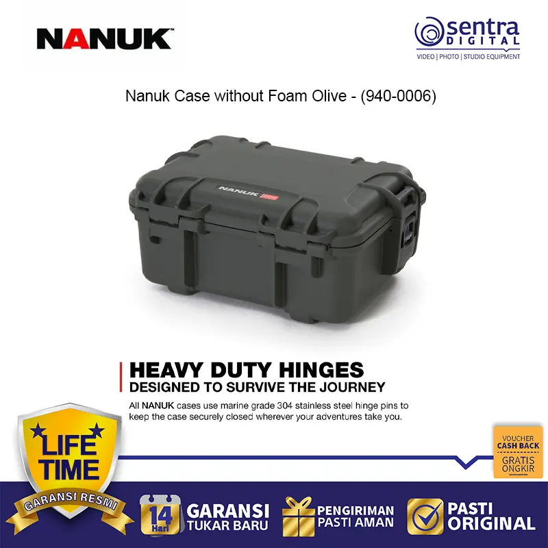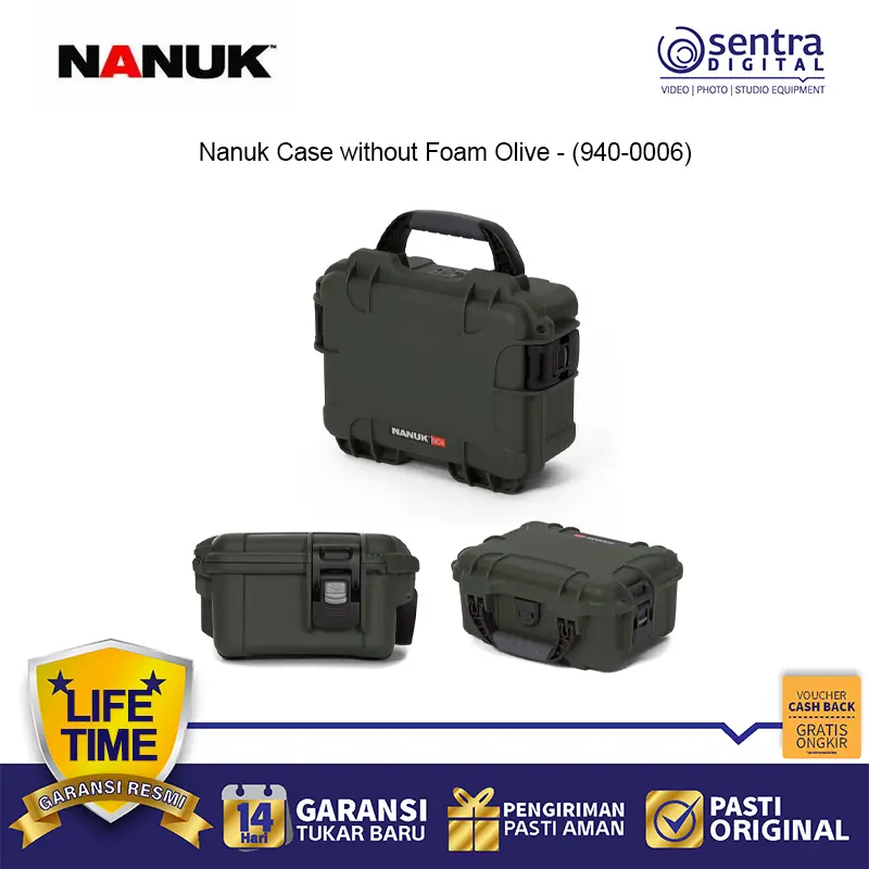 Nanuk Case without Foam Olive (940-0006) adalah kotak pelindung kokoh yang dirancang untuk melindungi perlengkapan dari air, debu, dan benturan. Terbuat dari resin NK-7 yang kuat dengan hardware baja tahan karat, dilengkapi sistem pengunci PowerClaw™ serta warna olive hijau untuk tampilan outdoor profesional. Versi ini hadir tanpa foam, memberi fleksibilitas untuk menyimpan kamera, drone, alat, atau perlengkapan sensitif sesuai kebutuhan.