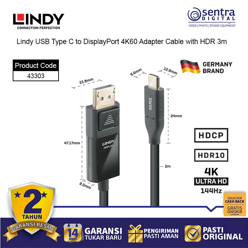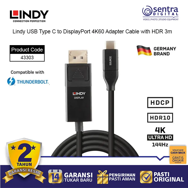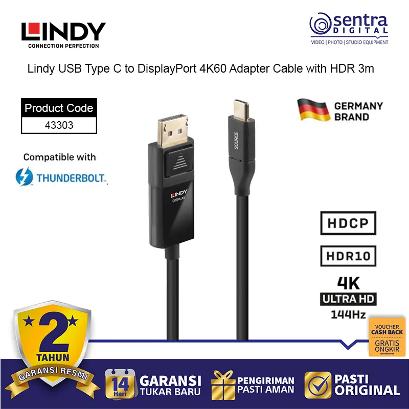Lindy USB Type-C to DisplayPort 4K60 Adapter Cable with HDR 3m (43303) menghadirkan konektivitas berkinerja tinggi antara perangkat USB-C dan monitor DisplayPort. Mendukung resolusi hingga 4K@60Hz dengan HDR, kabel sepanjang 3 meter ini memastikan visual tajam, warna kaya, dan tampilan mulus. Dibuat dengan material kokoh serta konektor berlapis emas, menjamin transmisi sinyal stabil untuk laptop, tablet, maupun kebutuhan profesional.
