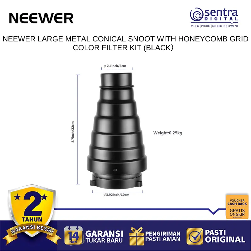 Neewer Large Metal Conical Snoot adalah aksesori pencahayaan berbahan logam kokoh yang dirancang untuk mempersempit dan memusatkan pancaran cahaya dari lampu studio menjadi sorotan yang tajam dan presisi. Dilengkapi dengan