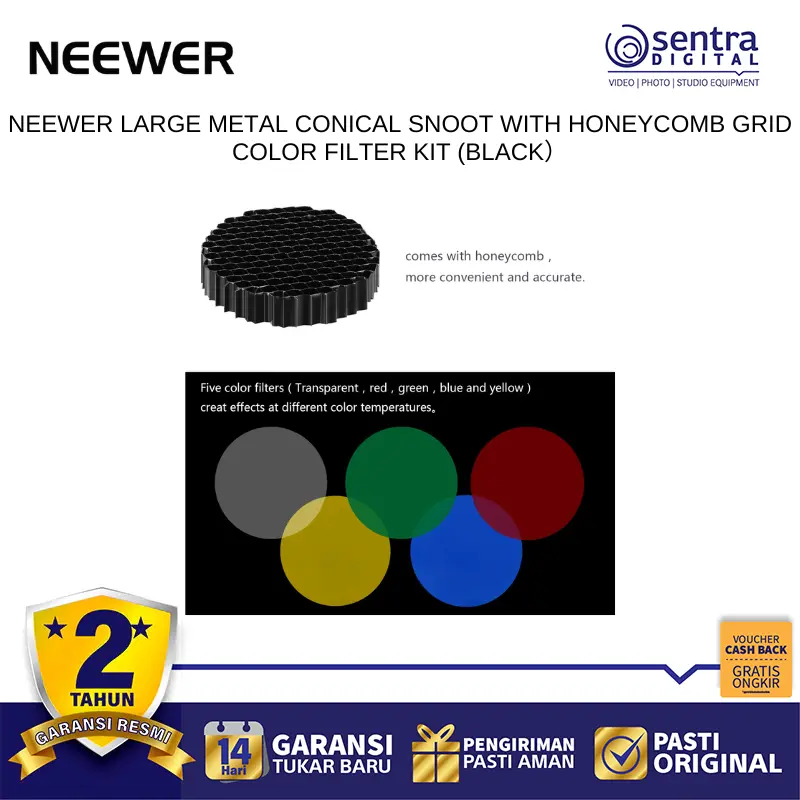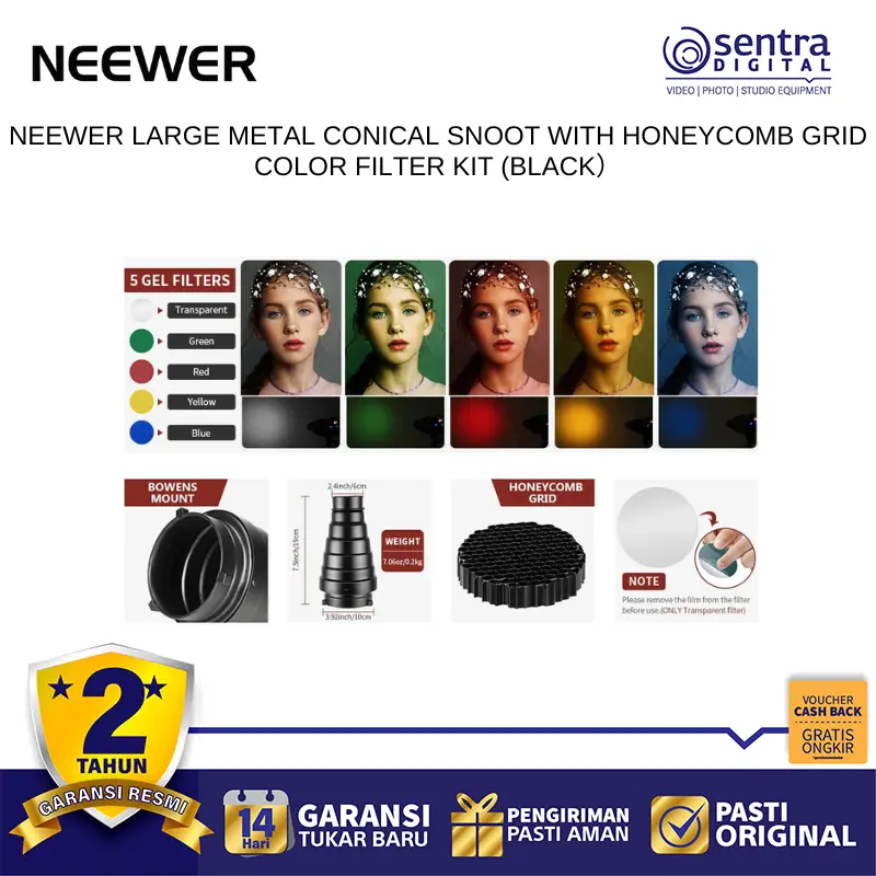 atau aksen latar belakang pada fotografi potret dan produk. Paket ini juga menyertakan beberapa filter warna yang memungkinkan fotografer bereksperimen dengan suasana artistik atau koreksi warna secara instan tanpa perlu mengganti lampu. Dengan dudukan tipe Bowens yang universal,