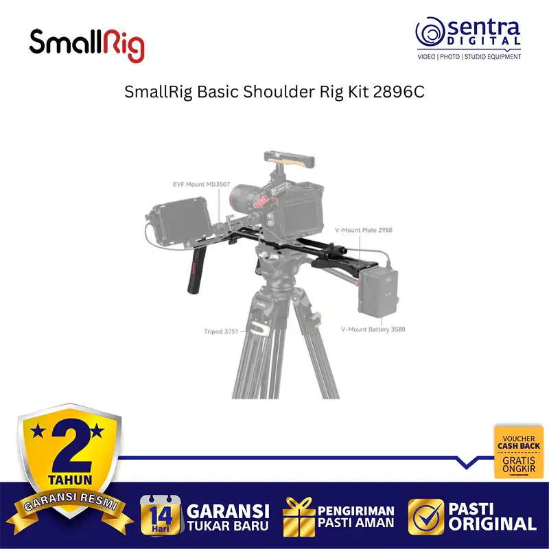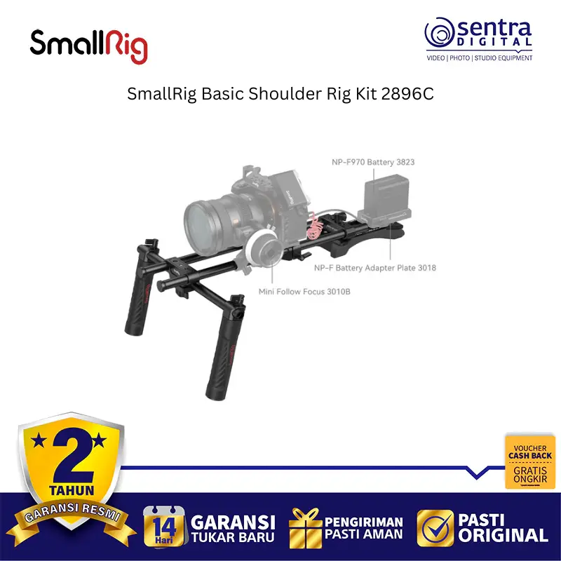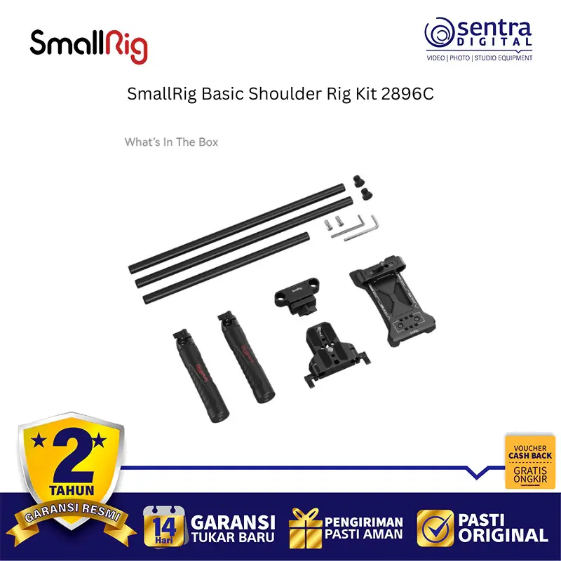 SmallRig Basic Shoulder Rig Kit 2896C adalah sistem penyangga bahu yang dirancang untuk memberikan kenyamanan dan stabilitas ekstra bagi pengguna kamera DSLR maupun kamera mirrorless selama pengambilan gambar dalam durasi lama. Kit ini menggunakan bantalan bahu ergonomis berbahan spons tingkat tinggi yang mengikuti lekuk tubuh untuk mengurangi beban pada lengan serta dilengkapi dengan dua pegangan tangan yang posisinya dapat diatur secara fleksibel melalui sistem rod 15mm. Dengan pelat dasar universal yang memiliki banyak lubang sekrup, rig ini memudahkan pemasangan berbagai aksesori tambahan seperti follow focus, matte box, atau baterai V-mount sebagai penyeimbang. Seluruh komponennya terbuat dari paduan aluminium yang ringan namun sangat kokoh, menjadikannya solusi profesional bagi videografer yang ingin mendapatkan hasil rekaman genggam yang halus dan bebas getaran tanpa mengorbankan mobilitas.