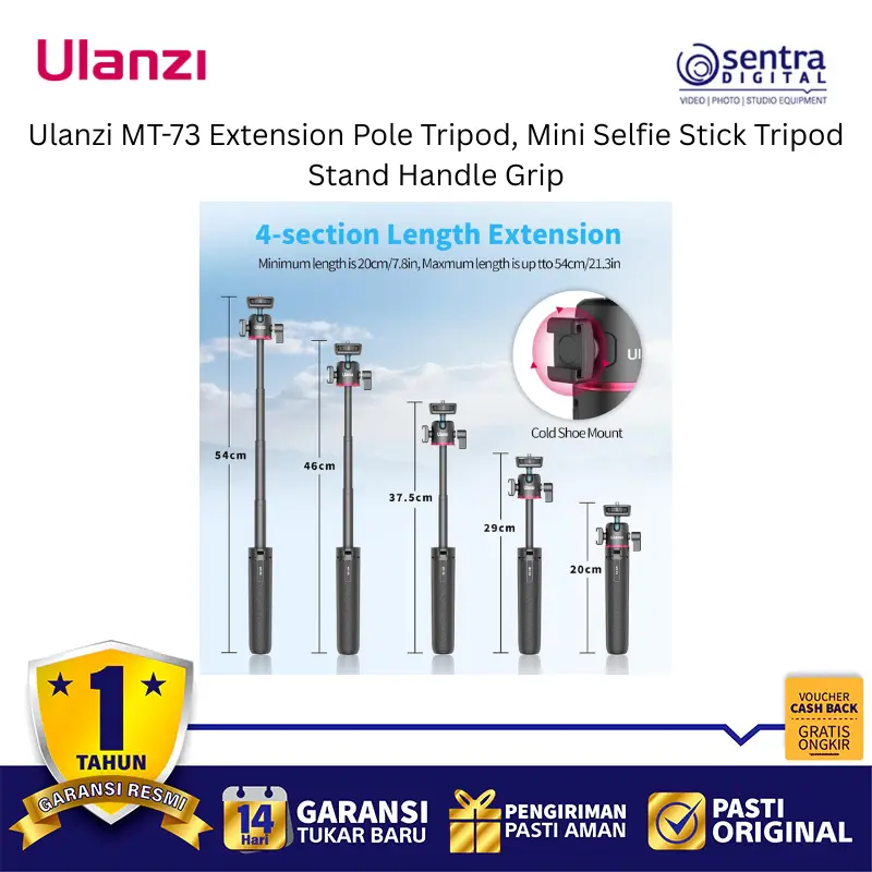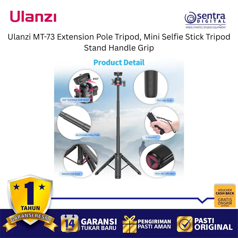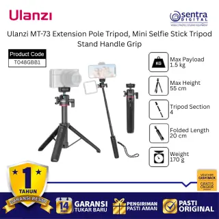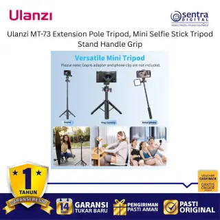 Ulanzi MT-73 Extension Pole Tripod adalah aksesori serbaguna yang menggabungkan fungsi tongsis, tripod meja, dan pegangan tangan dalam satu desain ringkas yang sangat portabel. Alat ini dilengkapi dengan tiang ekstensi yang dapat dipanjangkan untuk mendapatkan sudut pandang lebih luas saat berswafoto atau melakukan siaran langsung, serta kaki tripod yang kokoh dengan alas karet anti-slip untuk stabilitas maksimal di permukaan datar. Bagian kepalanya menggunakan sekrup standar 1/4 inci yang kompatibel dengan berbagai perangkat seperti kamera saku, action cam, atau dudukan ponsel, sementara material berkualitas tinggi memastikan daya tahan namun tetap ringan untuk dibawa bepergian. Dengan desain ergonomis yang nyaman digenggam, tripod mini ini menjadi solusi ideal bagi kreator konten yang membutuhkan fleksibilitas tinggi untuk pengambilan gambar statis maupun bergerak secara instan.