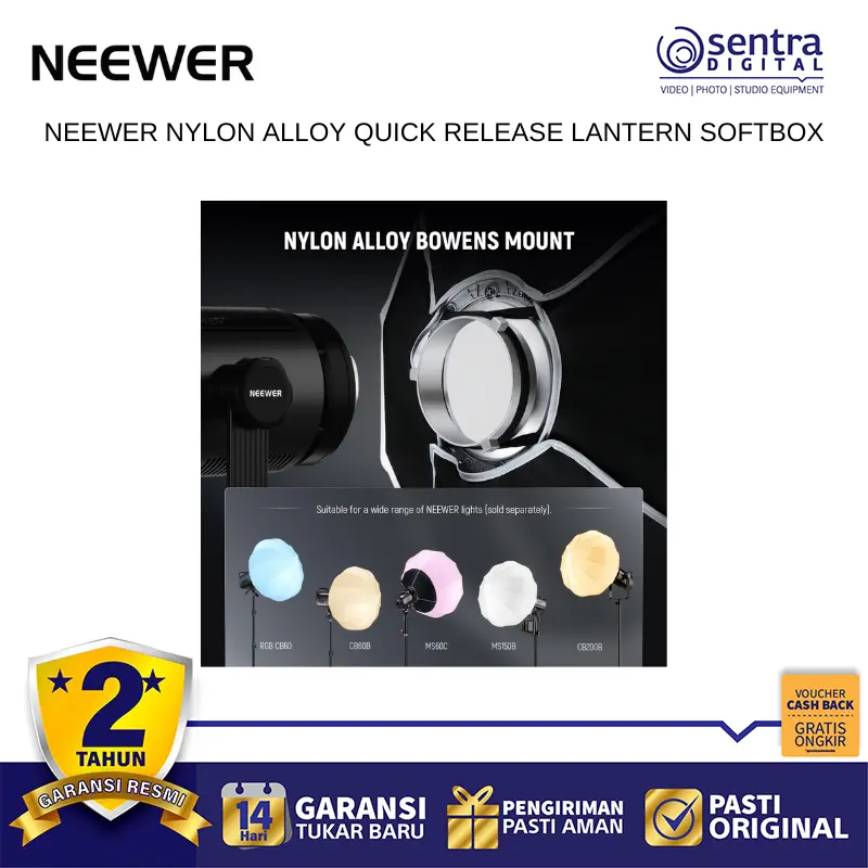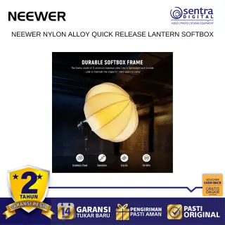 NEEWER Nylon Alloy Quick Release Lantern Softbox yang tersedia dalam ukuran 50cm, 65cm, dan 85cm merupakan modifikator cahaya berbentuk bola yang dirancang untuk menghasilkan pencahayaan lembut dan merata ke segala arah hingga 270 derajat. Seri NS20L, NS26L, dan NS35L ini menggunakan mekanisme penguncian cepat satu langkah yang memungkinkan perakitan dan pelipatan dalam hitungan detik, sangat praktis bagi kreator dengan mobilitas tinggi. Terbuat dari rangka paduan aluminium yang kokoh namun ringan serta kain nilon putih difusi berkualitas tinggi, softbox ini menjaga akurasi warna dan tahan panas untuk penggunaan jangka panjang. Dengan dudukan Bowens Mount standar, aksesori ini kompatibel dengan berbagai lampu studio LED maupun strobo, menjadikannya pilihan ideal untuk sinematografi, wawancara, dan fotografi potret yang membutuhkan cahaya alami yang mengisi seluruh ruangan