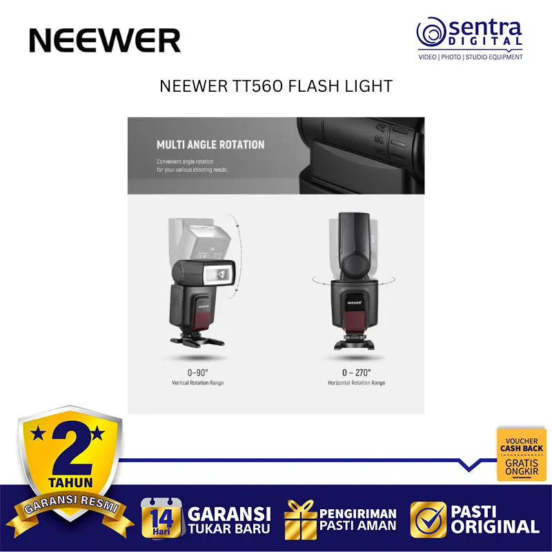 standar seperti Canon, Nikon, Olympus, hingga Pentax. Flash ini menawarkan kontrol manual penuh dengan delapan tingkat output daya yang dapat disesuaikan melalui tombol tekan sederhana di bagian belakang untuk mendapatkan pencahayaan yang presisi. Kepala lampunya sangat fleksibel karena dapat diputar secara vertikal hingga 90 derajat dan horizontal hingga 270 derajat, memungkinkan teknik