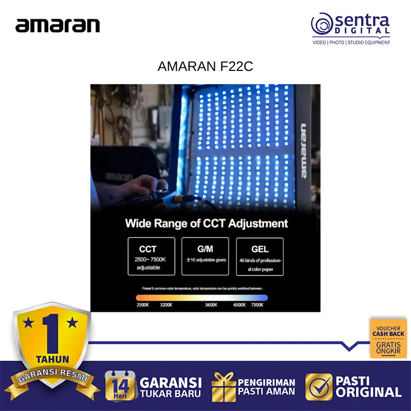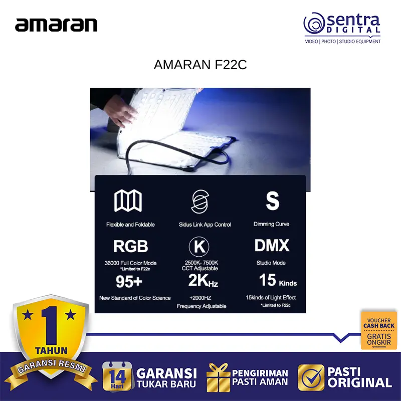 The 2 x 2' F22c RGBWW LED Mat from amaran is powerful, versatile, and flexible. Dengan output dan rendering warna yang kuat, alas ini cocok untuk para pembuat film, videografer, kreator konten, dan fotografer. Alas ini menyediakan daya 200W dengan LED RGBWW untuk kontrol warna yang lengkap dan CCT yang dapat disesuaikan dari 2500 hingga 7500K, memberikan kemungkinan tak terbatas untuk pencahayaan kreatif. Kontrol HSI 360°, 46 preset gel warna, dan 15 efek pencahayaan unik memberikan lebih banyak cara untuk menyesuaikan pencahayaan Anda. Dilengkapi skor CRI dan TLCI 95+ dan 97+ untuk memastikan warna yang akurat, alas ini juga memiliki peredupan stepless dari 0 hingga 100%. Bingkai X yang dapat dilipat meregangkan alas untuk membentuk panel kaku yang dapat Anda pasang langsung ke kepala pegangan C-stand menggunakan dudukan dudukan yang dapat dimiringkan. Softbox lipat yang disertakan memiliki dua kekuatan difusi, dan kisi-kisi telah mengintegrasikan kain kait-dan-lingkaran untuk menggunakan alas sebagai lampu lembut ultratipis yang akan menambahkan suasana terkendali pada suatu pemandangan.
