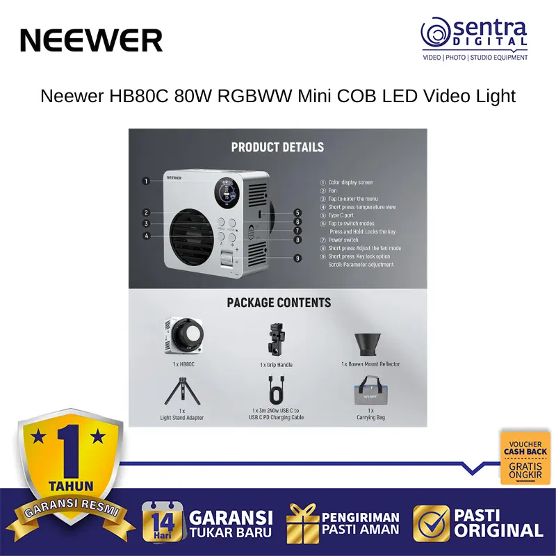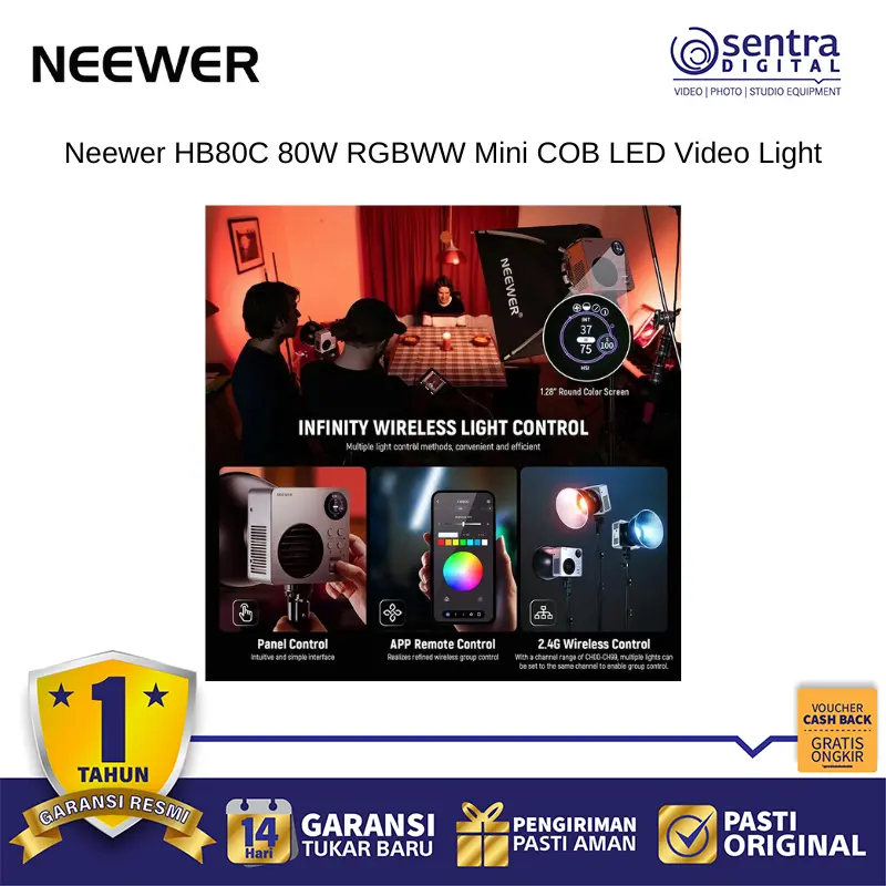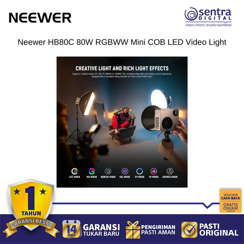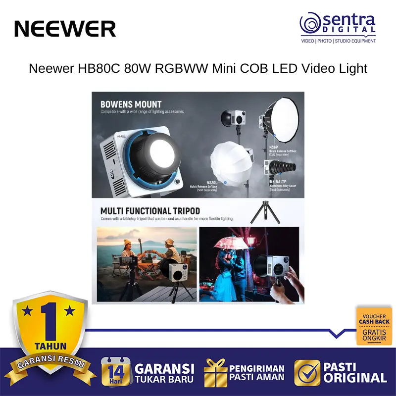 Ringkas dan berdaya tinggi, 80W HB80C RGBWW Mini LED Monolight Basic Kit portabel dari Neewer menawarkan cahaya yang luas dan berwarna-warni untuk kreator konten dan vlogger. Dengan output 10.400 lux pada jarak 3,3 kaki (9,6 meter) dengan reflektor yang disertakan, HB80C menerangi berbagai situasi di mana pun, termasuk wawancara di jalan, pernikahan, dan acara streaming langsung di luar ruangan. Dengan teknologi pencampuran RGBWW, monolight ini menggunakan pergeseran koreksi hijau/magenta untuk menghasilkan cahaya berwarna akurat. Mudah dibawa dan dipegang dengan pegangan yang disertakan, HB80C dapat ditenagai dengan kabel USB-C yang disertakan atau baterai V-mount yang tersedia terpisah. Atau, gunakan Pengisi Daya USB Type-C Xcellon Mighty Mini 165 65W GaN yang tersedia terpisah dengan kabel USB-C untuk mengisi daya lampu. Kemampuan pengaturan suhu warna 2500-7500K, tujuh mode pencahayaan, dan 18 efek pencahayaan khusus menawarkan pilihan pencahayaan unik hingga 70 menit. Kontrol onboard, nirkabel, dan aplikasinya memungkinkan kendali jarak jauh atas lampu. Untuk kontrol cahaya yang lebih baik, pasang pengubah cahaya menggunakan dudukan Bowens lampu.