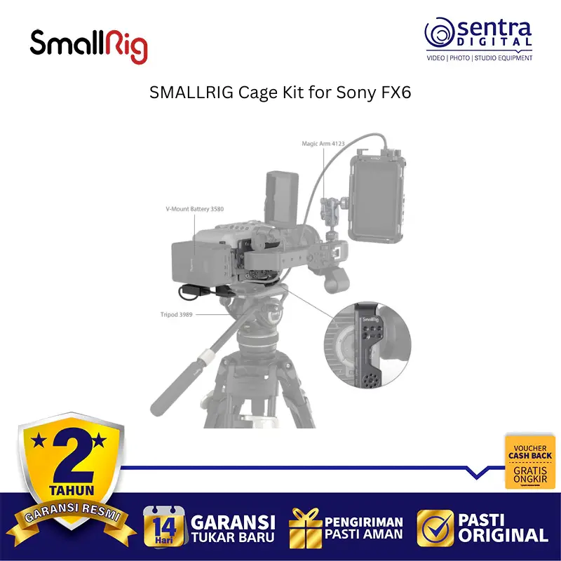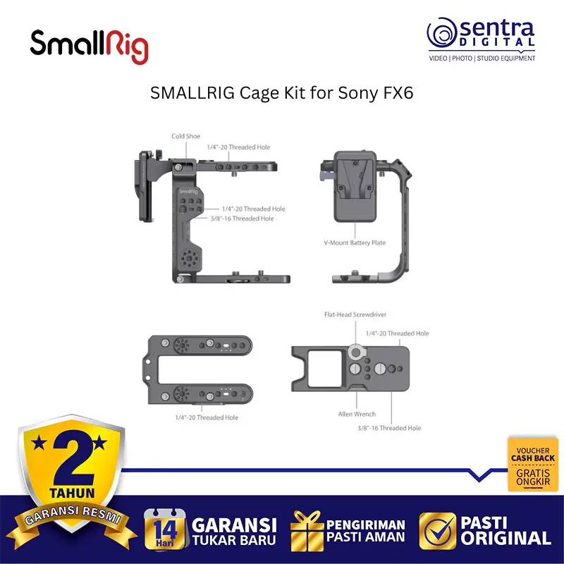 Lindungi dan tambahkan aksesori ke kamera Sony FX6 Anda dengan Camera Cage dari SmallRig . Kandang modular yang ringan dan ringkas ini terdiri dari pelat dasar, pelat samping, pelat atas, pelat baterai V-mount, dan kabel daya D-Tap. Pelat dasar lepas cepat ini dapat digunakan dalam posisi horizontal standar maupun vertikal untuk mengambil foto media sosial. Beberapa aksesori dapat dipasang menggunakan dudukan cold shoe atau ulir 1/4"-20, 3/8"-16, dan anti-puntir 3/8"-16.