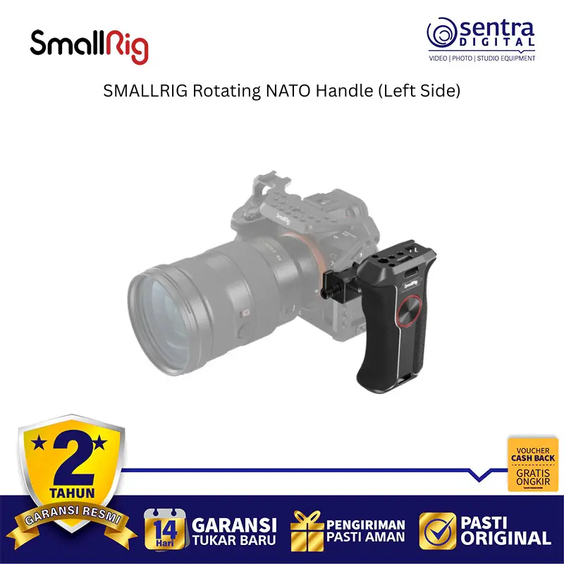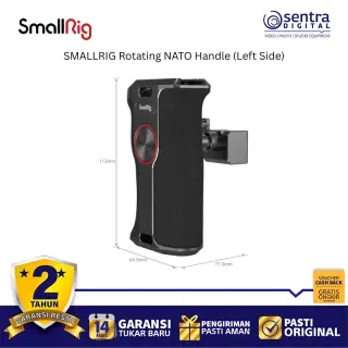 SmallRig Rotating NATO Left-Side Handle ini memberikan pegangan yang aman untuk kamera, sangkar, atau rig Anda yang dilengkapi rel NATO dengan berat hingga 5,5 kg. Gagang aluminium ini dikonfigurasi untuk penggunaan sisi kiri dan dapat berputar 360° untuk pemosisian optimal menggunakan tombol buka kunci cepat. Gagang ini juga dilengkapi rel NATO 2" dengan dua sekrup 1/4"-20 untuk dipasang ke sangkar atau rig yang tidak dilengkapi rel NATO.
