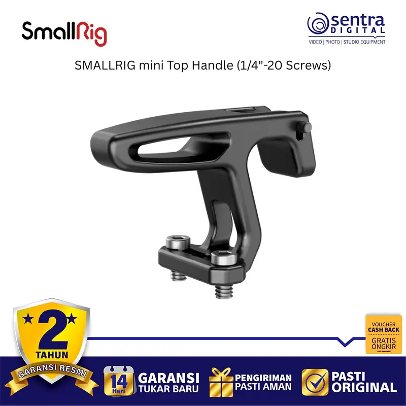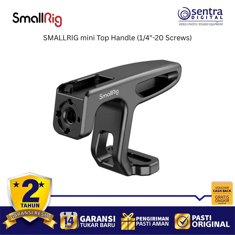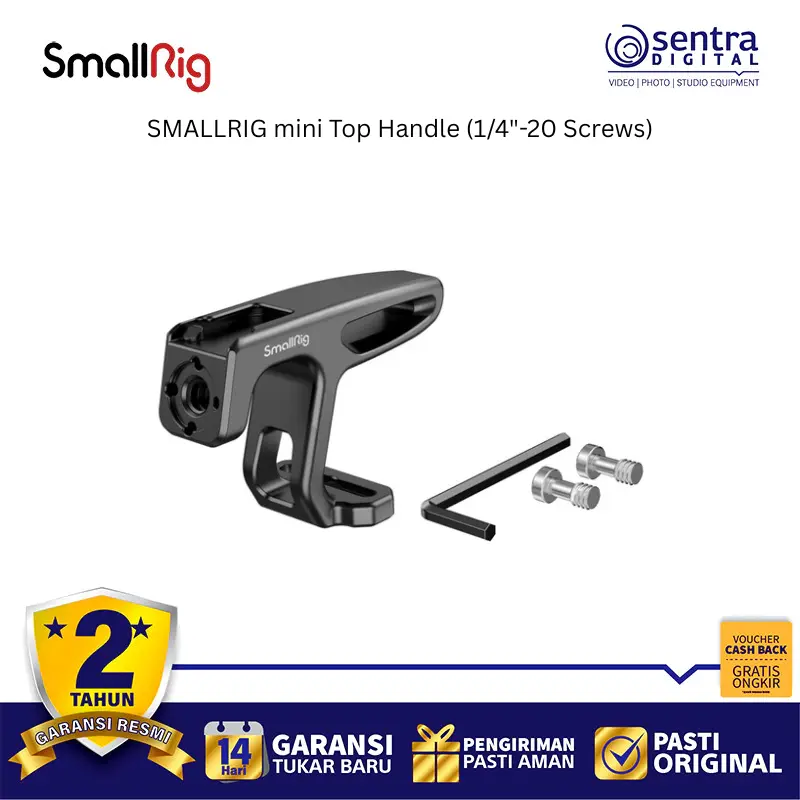 Mini Top Handle serbaguna dari SmallRig dapat dipasang dengan cepat ke kamera, cage, atau rig Anda menggunakan dua sekrup pemasangan 1/4"-20 untuk memberikan titik pegangan yang seimbang bagi kamera digital atau camcorder Anda yang kecil dan ringan. Gagangnya yang ringkas dan berkontur terbuat dari aluminium yang tahan lama. Fitur tambahan termasuk dudukan shoe di bagian atas dan dudukan aksesori anti-lilit bergaya ARRI di bagian depan.