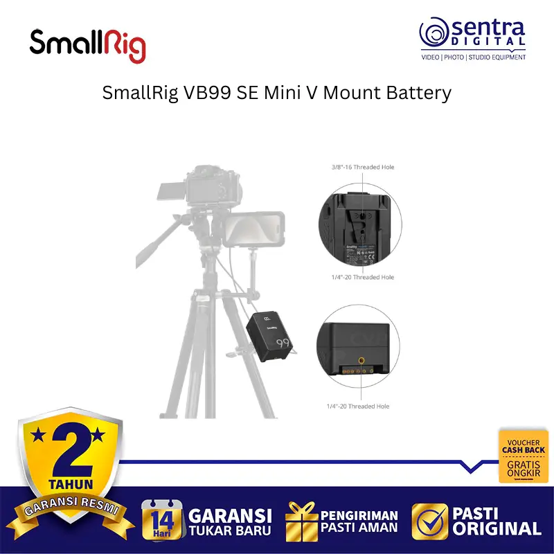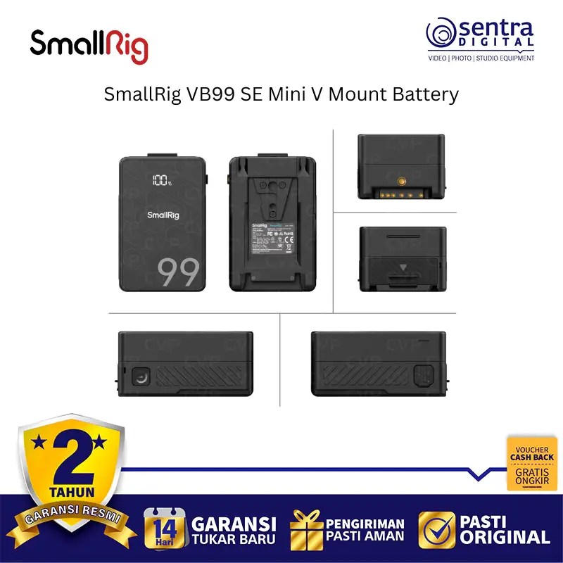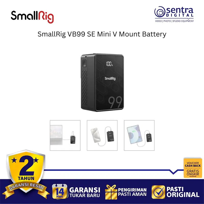 Baterai V-Mount Mini VB99 SE dari SmallRig adalah baterai 99Wh ultra-ringkas dan ringan yang dapat mendukung penarikan hingga 10A pada tegangan nominal 14,8V. Baterai yang ringkas dan mudah dibawa bepergian ini cocok untuk memberi daya pada kamera genggam, drone, dan gimbal, serta memiliki casing tahan api. Layar OLED internal menampilkan sisa kapasitas dan status baterai.