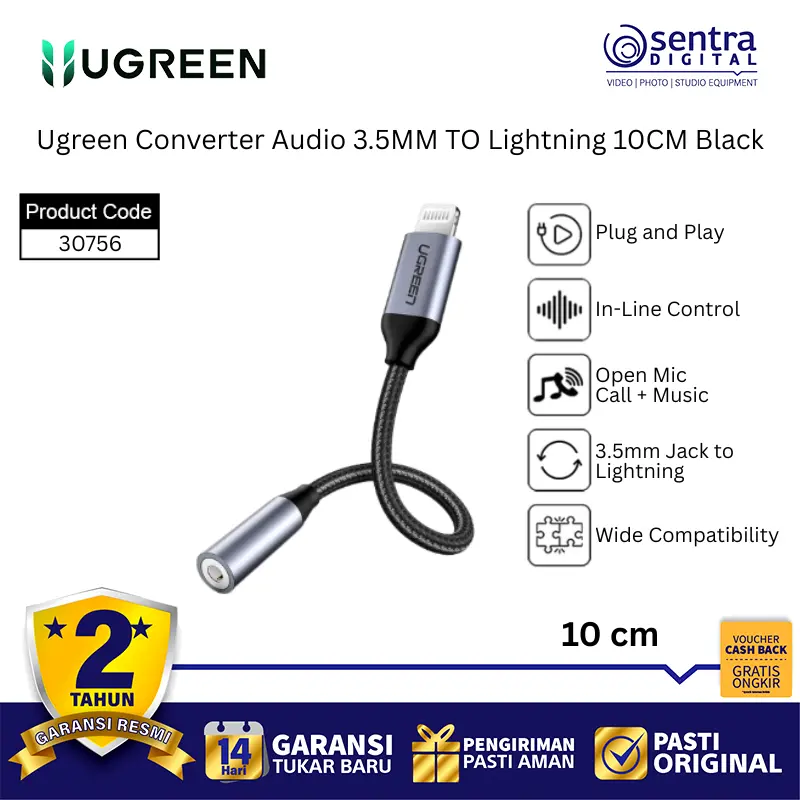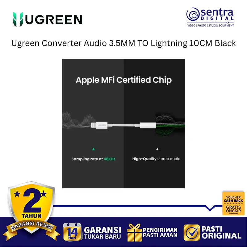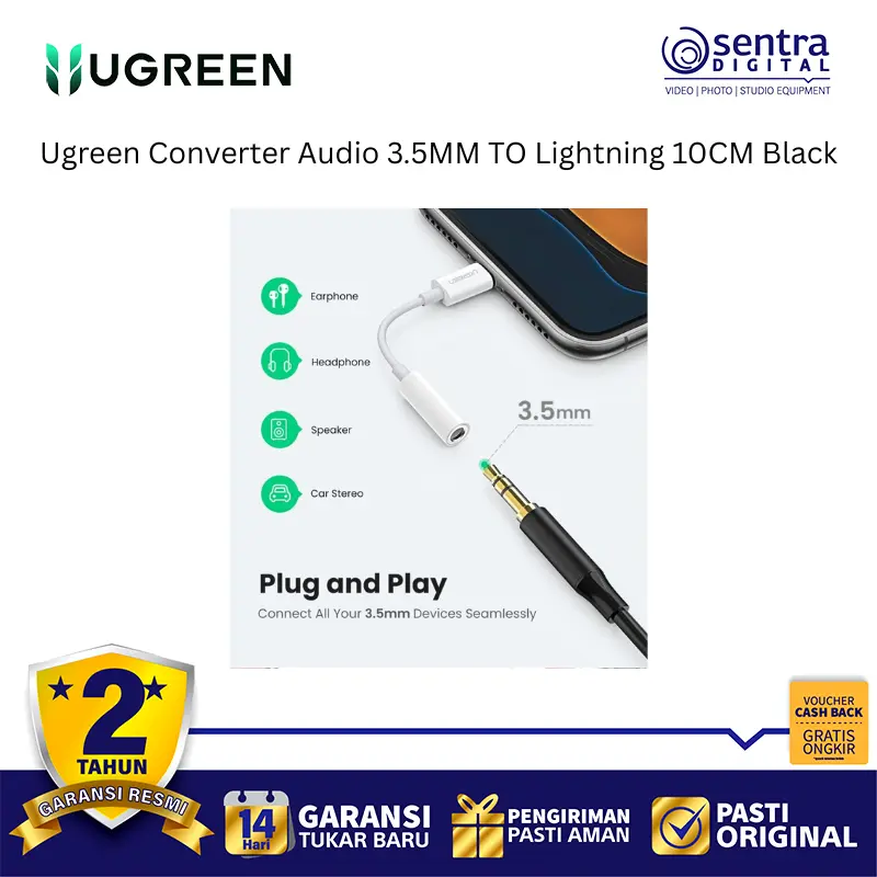 Ugreen Converter Audio 3.5MM TO Lightning (Model 30756) adalah adaptor pendek sepanjang 10cm berwarna hitam yang berfungsi untuk menyambungkan headphone atau speaker tradisional yang menggunakan jack audio 3.5mm ke perangkat Apple seperti iPhone atau iPad yang hanya memiliki port Lightning.