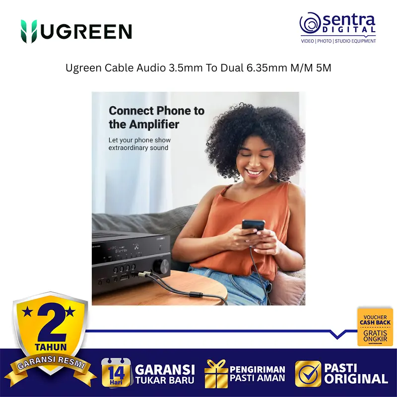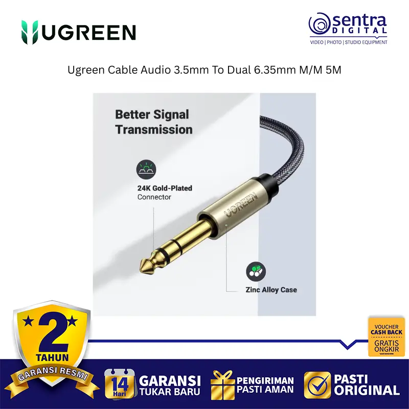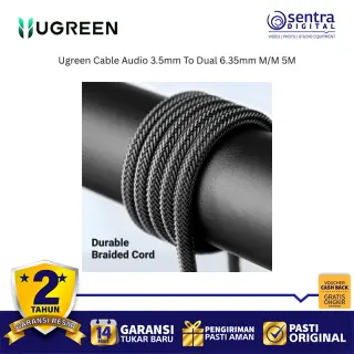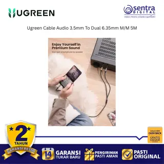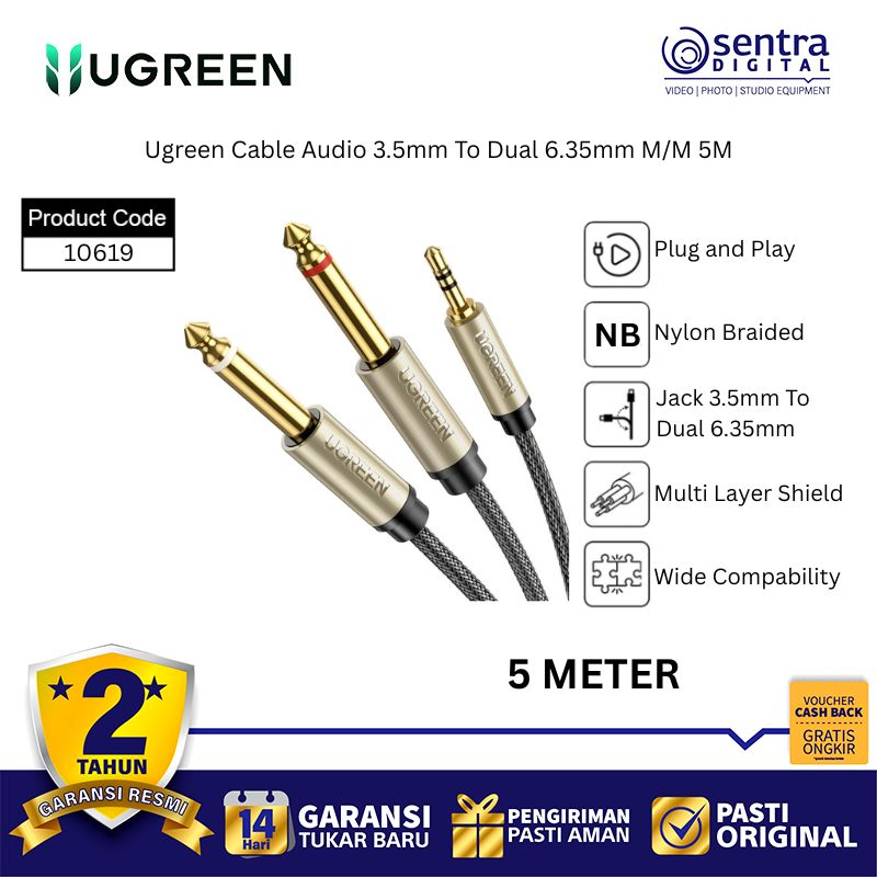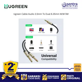 Ugreen Cable Audio 3.5mm to Dual 6.35mm M/M 5M (Model 10619): Kabel ini adalah kabel audio yang dirancang untuk menghubungkan perangkat audio portabel (seperti ponsel, laptop, pemutar MP3) ke peralatan audio profesional seperti mixer, amplifier, speaker aktif, atau sistem PA.