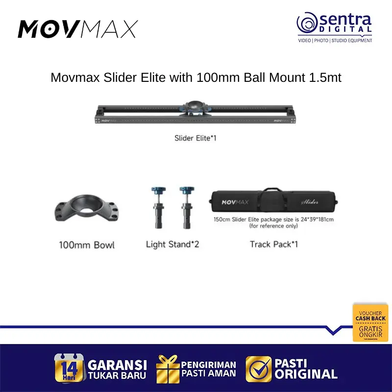 Dapatkan bidikan geser yang mulus menggunakan MOVMAX Slider Elite with 100mm Bowl Mount dan rel aluminium tugas berat sepanjang 82,6 inci. Sistem geser berbasis gesekan menghasilkan bidikan geser yang mulus dan senyap dengan pengoperasian manual. Dua adaptor dudukan lampu dengan receiver 5/8 inci disertakan untuk memasang slider pada dudukan lampu atau dudukan C. Kereta dorong terintegrasi dilengkapi dudukan mangkuk 100mm untuk mengamankan sebagian besar konfigurasi kamera dengan kepala fluida setengah bola 100mm. Membawa sistem ini saat bepergian pun mudah, berkat tas jinjing yang disertakan.